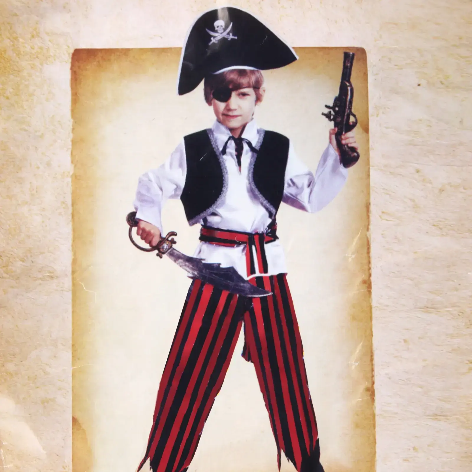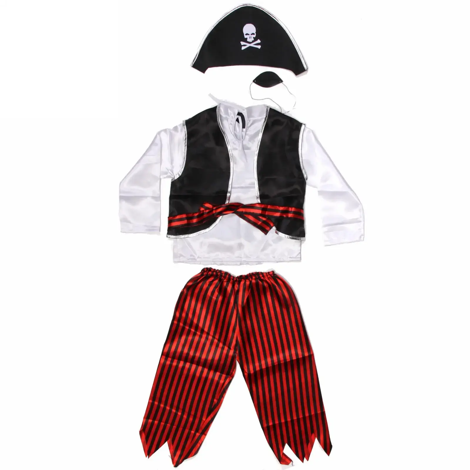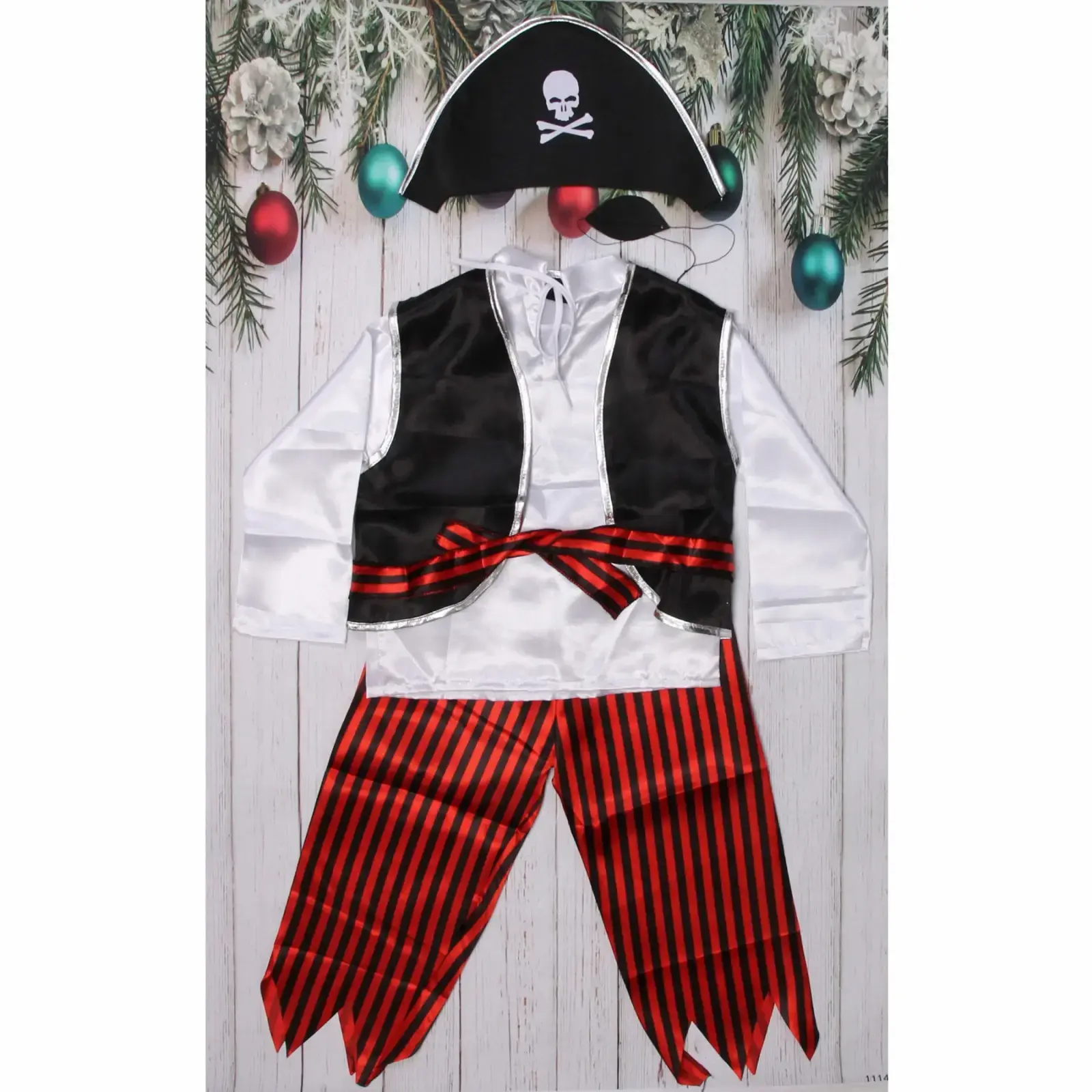 Костюм состоит из нескольких элементов: черного жилета с серебристой окантовкой, белой рубашки с длинными рукавами, широкого красного пояса и брюк с красными и черными вертикальными полосами. Также в комплект входит пиратская шляпа с изображением черепа и костей, что добавляет завершенности образу. Этот костюм подходит для мальчиков, которые хотят стать настоящими пиратами на празднике.