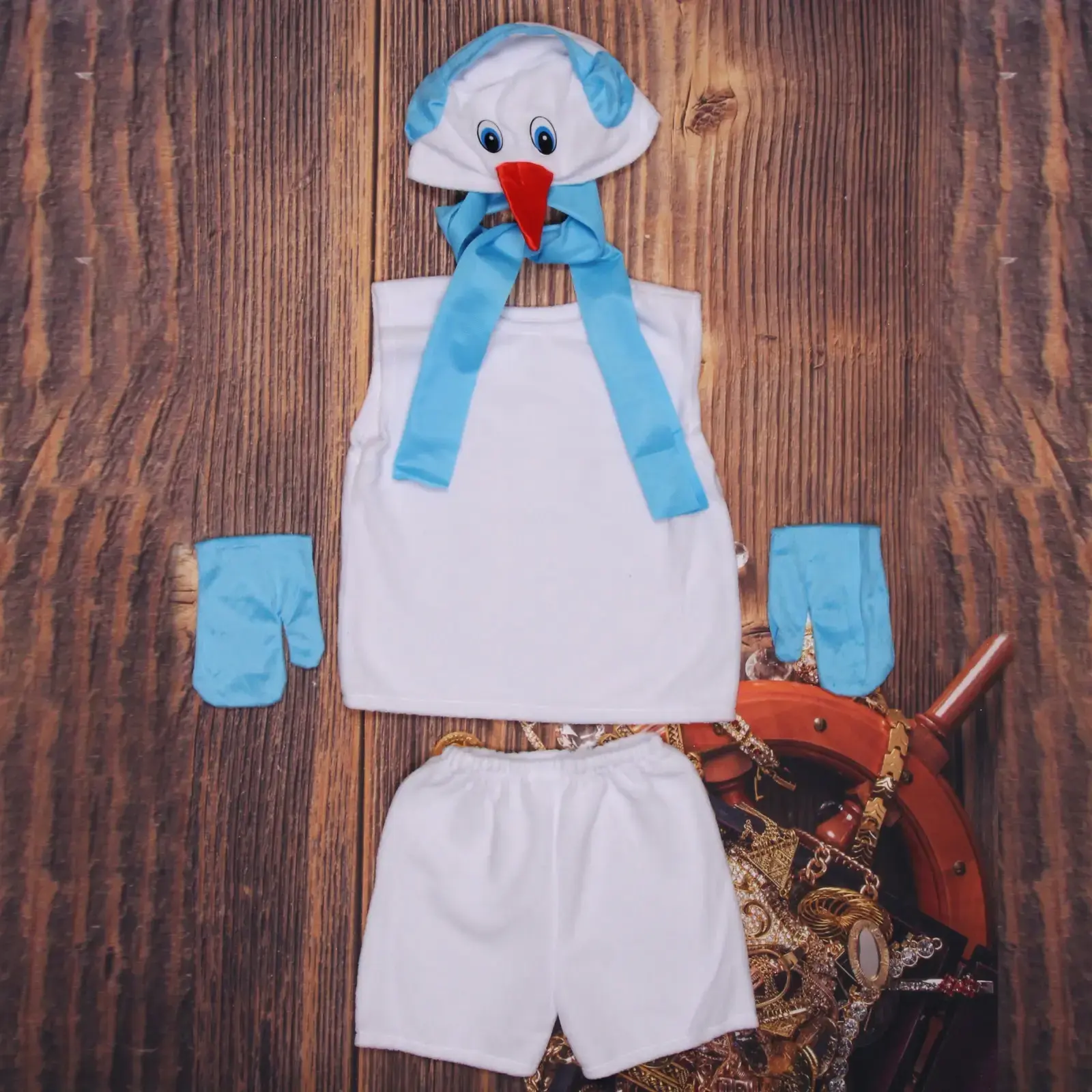 Костюм состоит из нескольких элементов: шапочки, жилета, шорт и перчаток. Шапочка имеет форму головы снеговика, что добавляет образу игривости и веселья. Жилет без рукавов и шорты выполнены в белом цвете с голубыми элементами, что делает костюм ярким и запоминающимся. Перчатки короткие, с открытыми пальцами, что позволяет ребенку свободно двигаться и играть.
