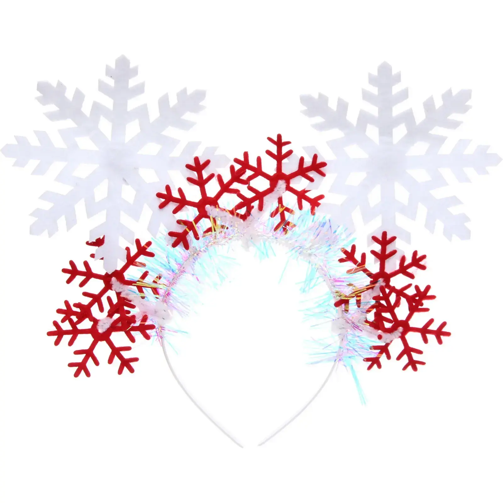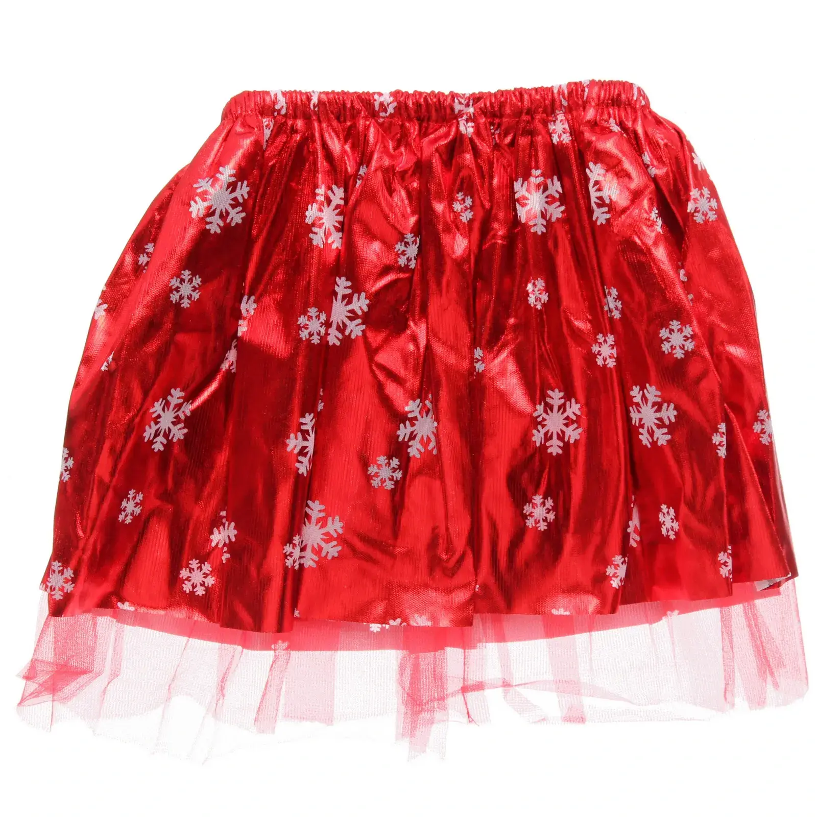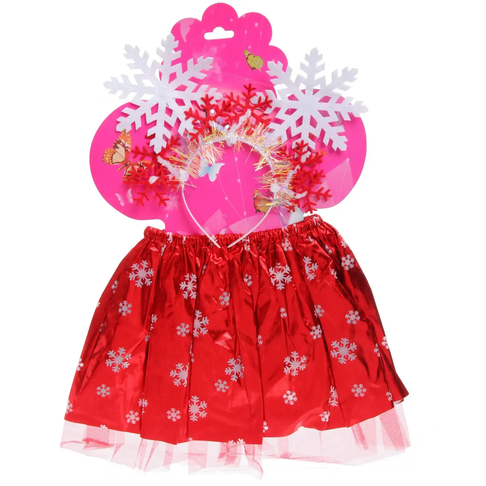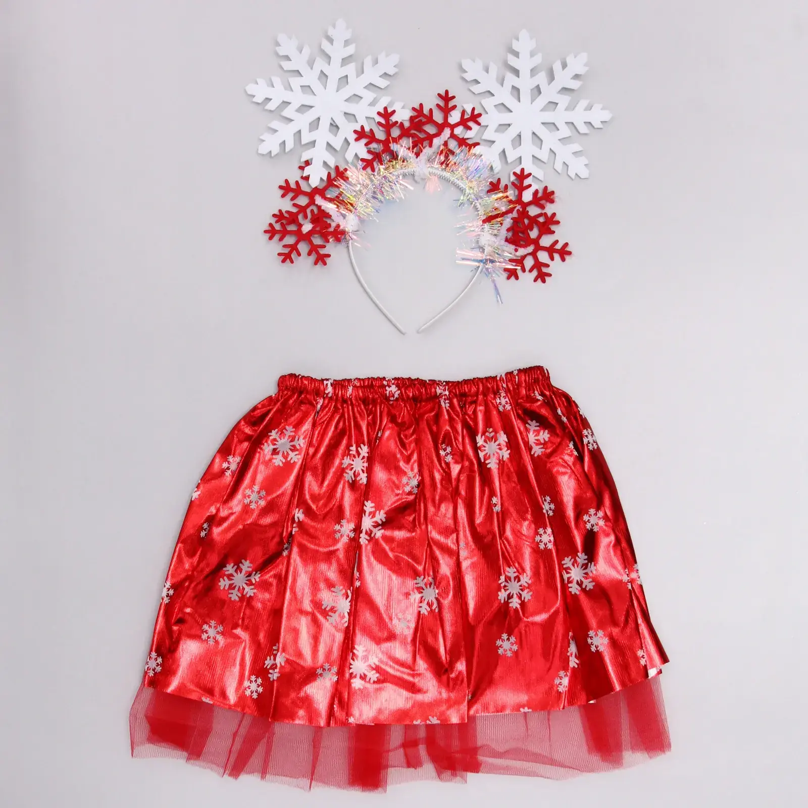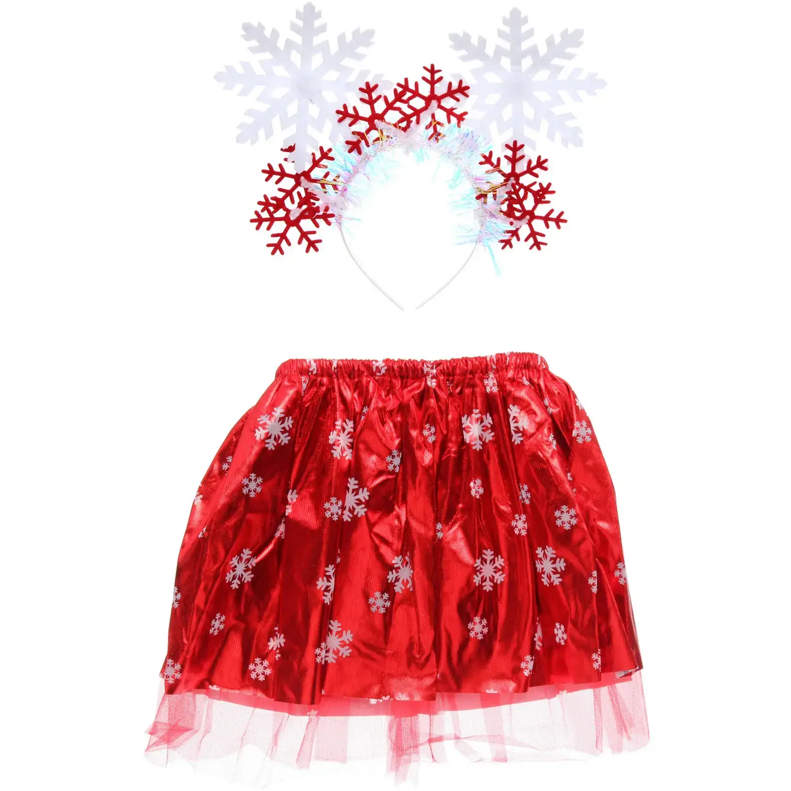 Юбка имеет блестящую поверхность и украшена белыми снежинками, что придает ей праздничный вид. Ободок выполнен в белых и красных цветах, с использованием блестящего материала, что создает эффект сверкания. Этот костюм станет отличным выбором для создания яркого и запоминающегося образа на любом празднике.