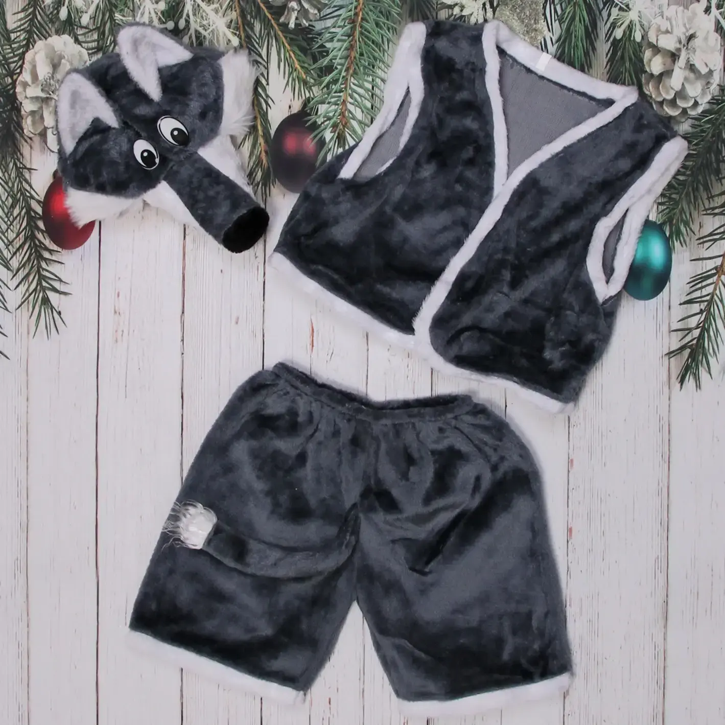 Костюм состоит из трех частей: жилета, штанов и головного убора. Жилет серого цвета с белыми вставками по краям без рукавов обеспечивает комфорт и легкость. Штаны также серого цвета, выполнены из мягкого текстиля и имеют эластичный пояс, что делает их удобными для носки. Головной убор в форме головы волка с большими выразительными глазами и черным носом добавляет образу завершенность и оригинальность.