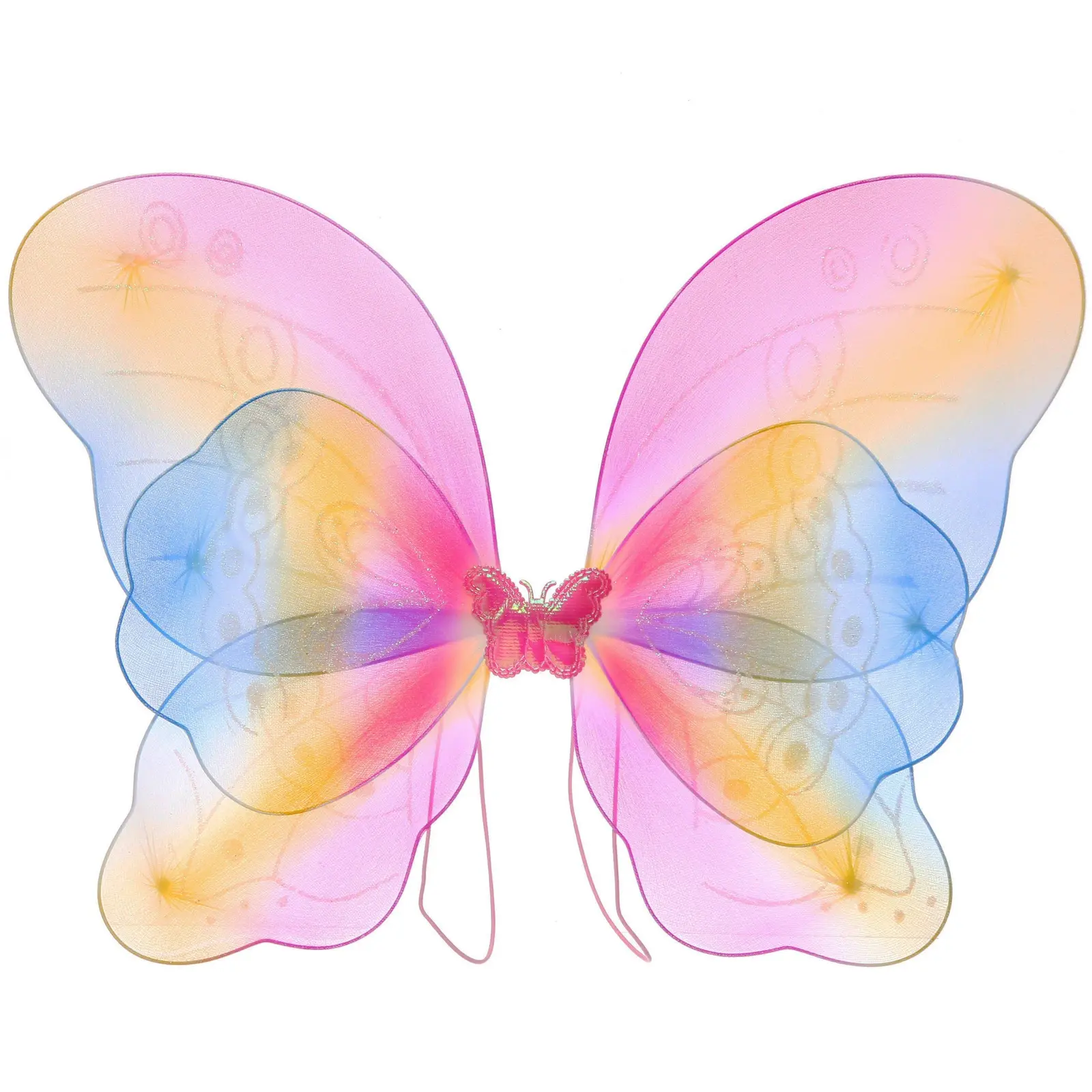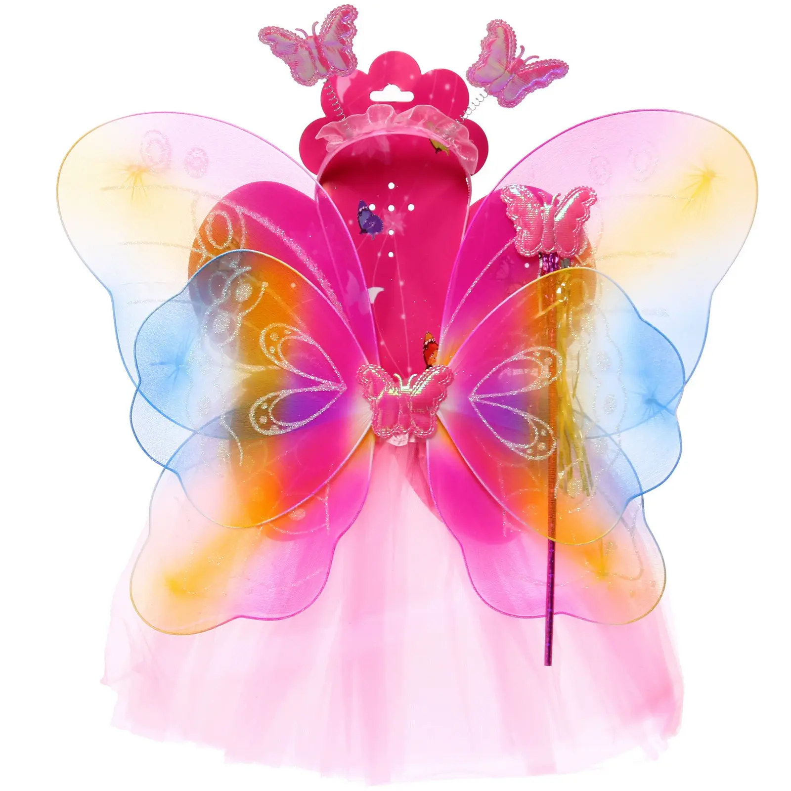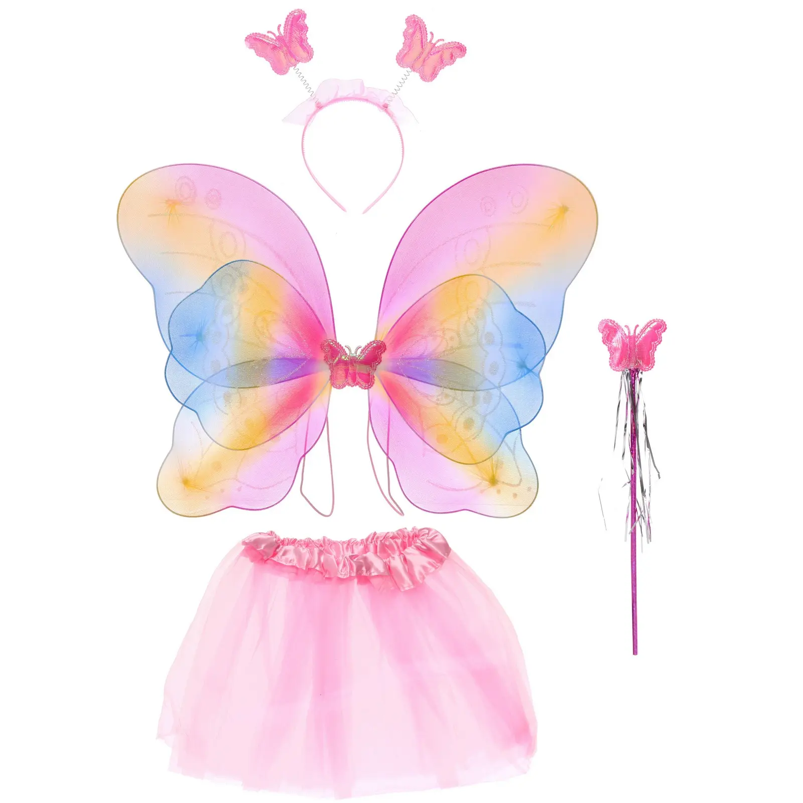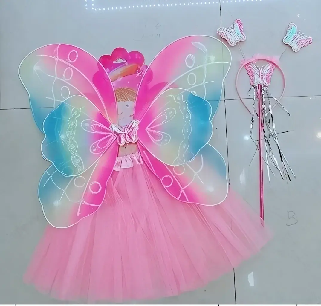 Костюм состоит из юбки, крыльев, волшебной палочки и ободка. Юбка выполнена из легкого фатина светло-розового цвета, а крылья имеют многоцветный градиент и узор на прозрачной ткани. Волшебная палочка украшена блестящими ленточками и бабочкой на верхушке, что добавляет образу игривости. Ободок с декором в виде бабочек завершает волшебный образ.