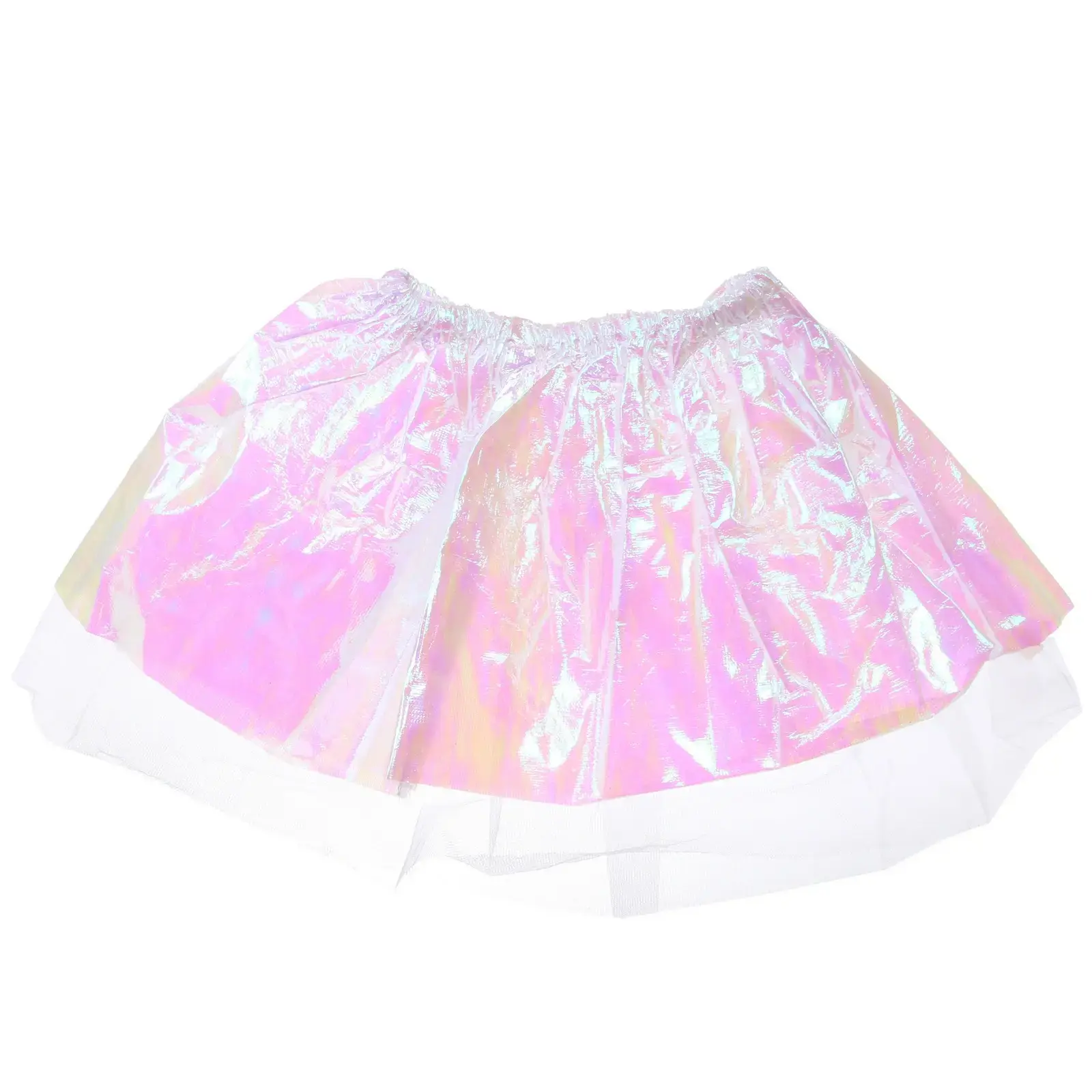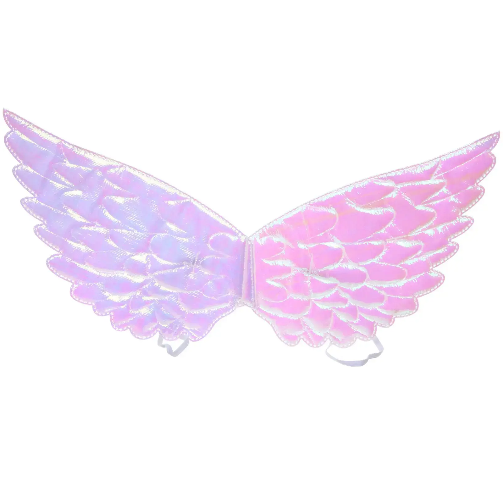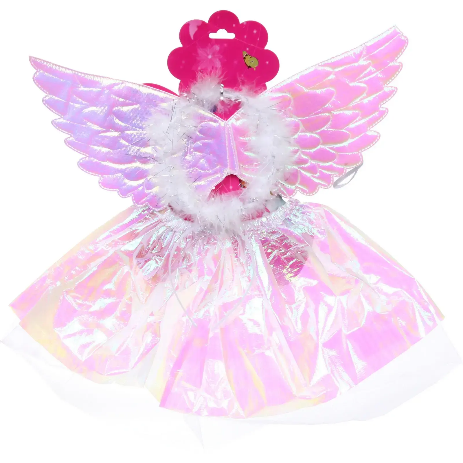 Костюм выполнен из качественных материалов: полиэстера и пластика, что обеспечивает долговечность и комфорт при носке. Радужные цвета и блестящие элементы делают его особенно привлекательным. Крылья имеют симметричную форму и легкий вес, что позволяет легко их носить. Ободок с нимбом добавляет завершенности образу, а юбка с прозрачным нижним слоем создает эффект воздушности.