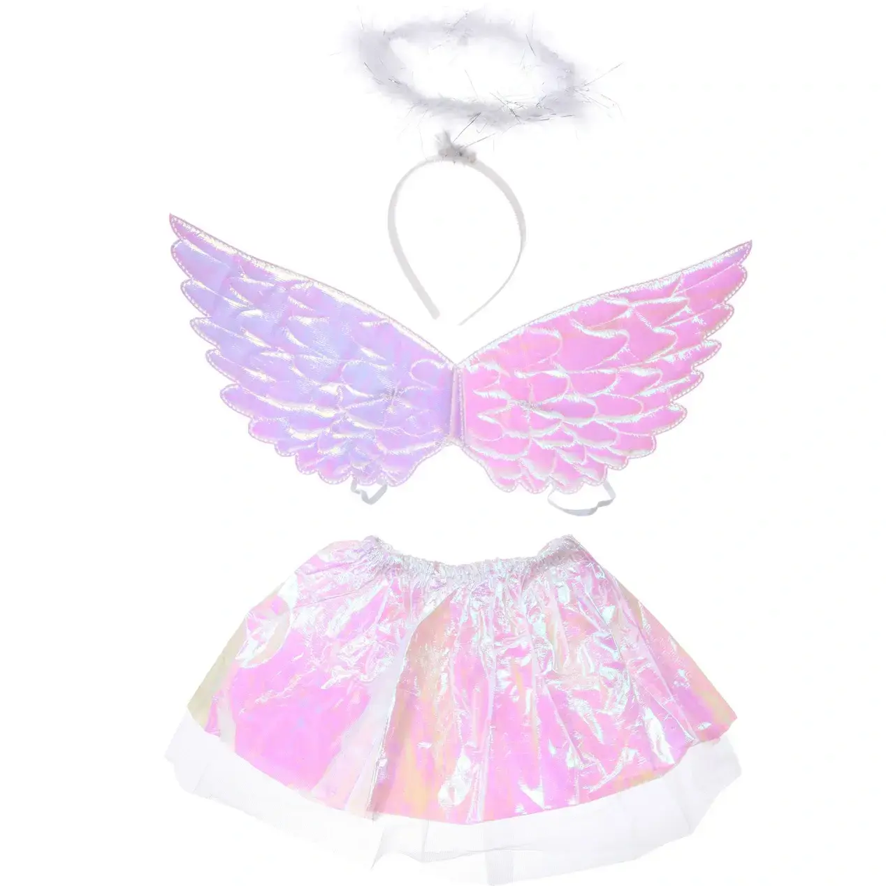 Костюм включает в себя юбку, крылья и ободок, что делает его полноценным набором для создания образа ангела. Он подходит для детей, которые хотят порадовать своих друзей на утренниках, карнавалах или Хэллоуине. Легкий и удобный, костюм не стесняет движений, позволяя вашему ребенку весело проводить время.