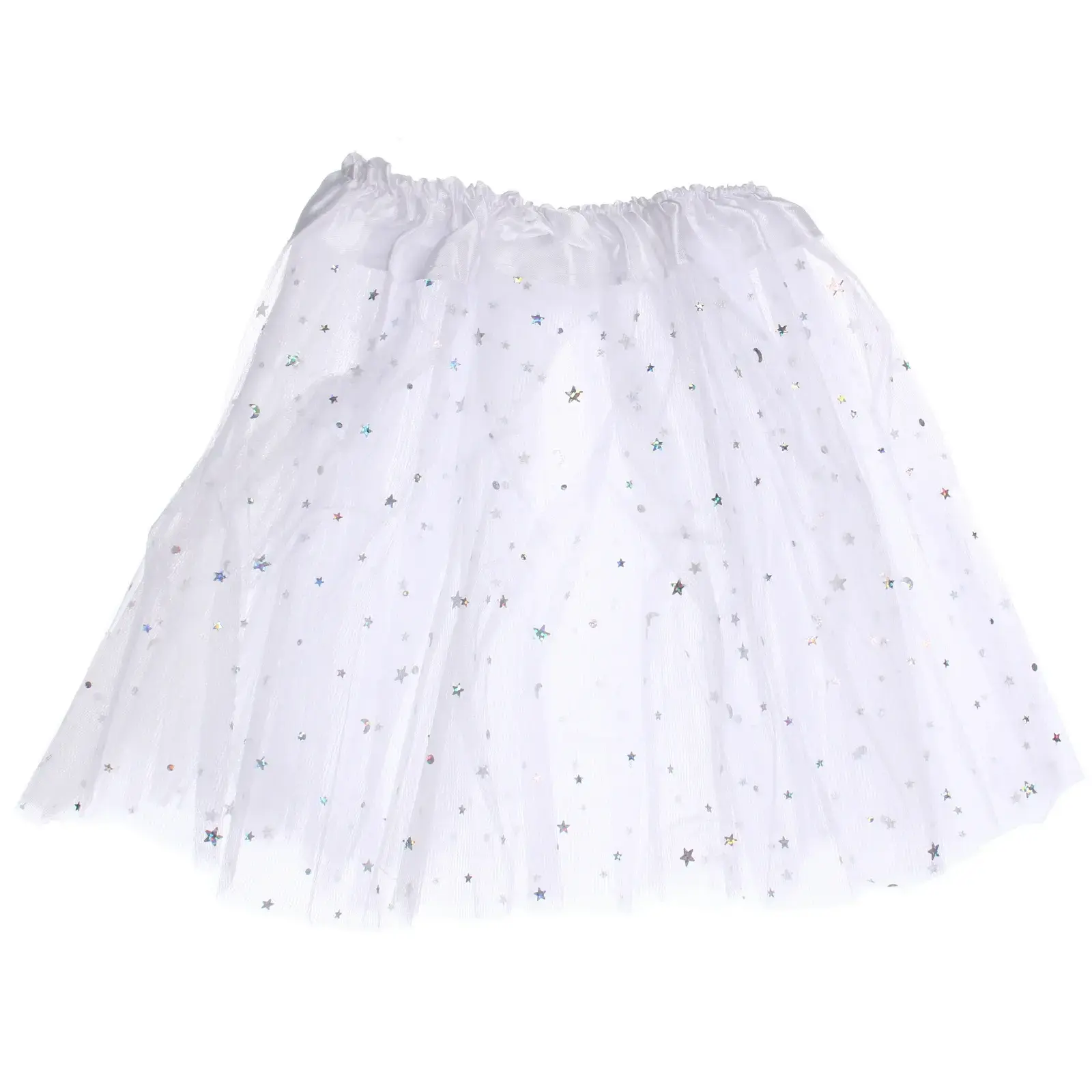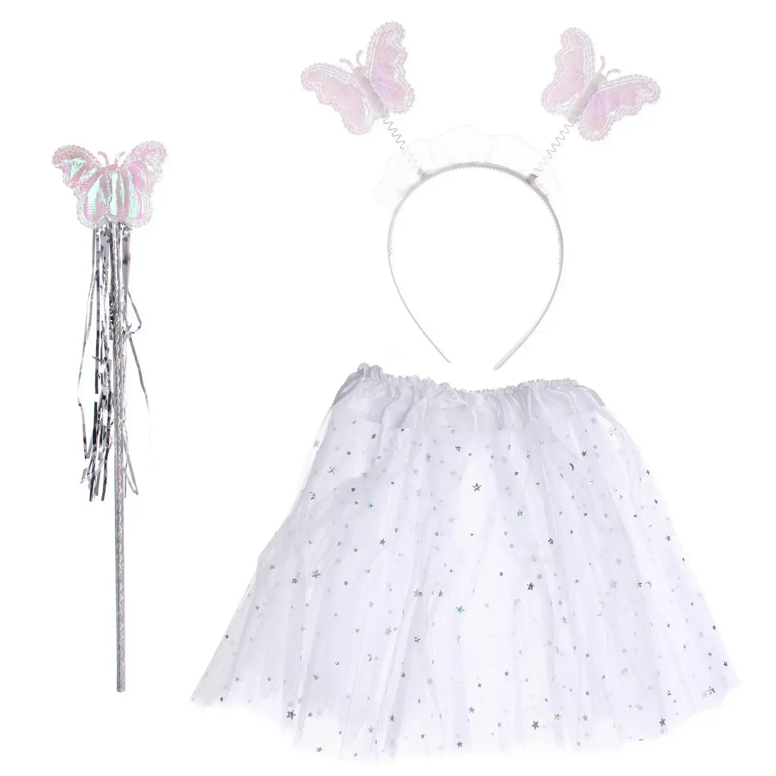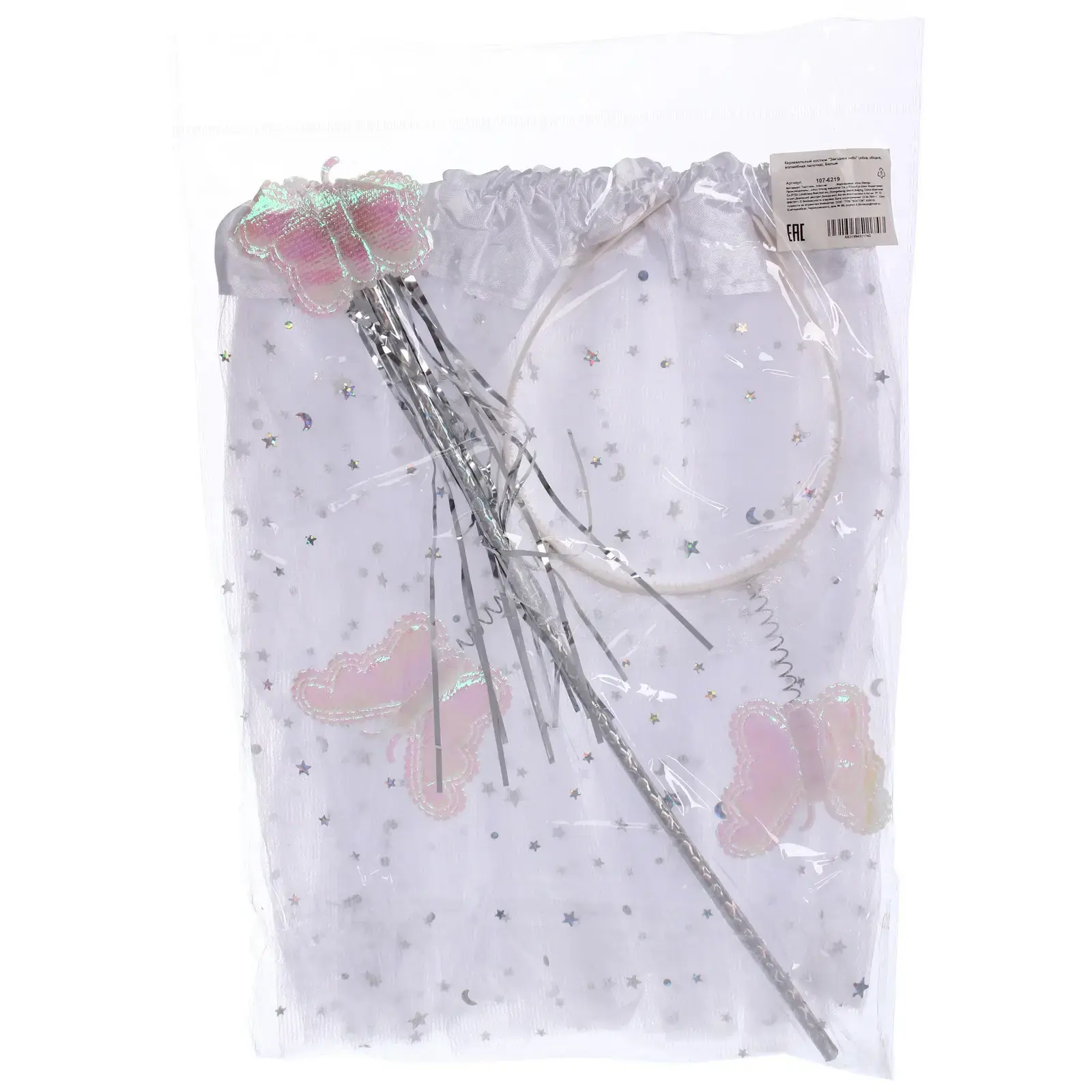 Костюм состоит из трех элементов: юбки, ободка и волшебной палочки. Юбка выполнена из белого полупрозрачного материала с блестящими звездочками, создающими эффект звездного неба. Ободок украшен двумя бабочками, выполненными в нежных розовых тонах, а волшебная палочка имеет серебристый цвет и длинные блестящие ленты. Все элементы костюма легкие и удобные, что делает их идеальными для активных игр.