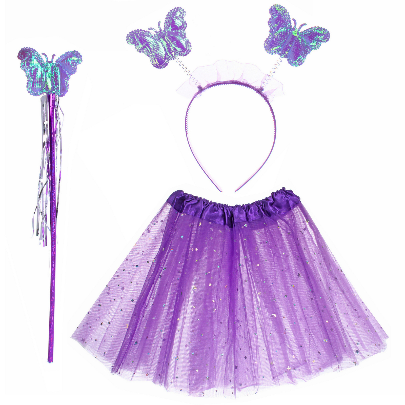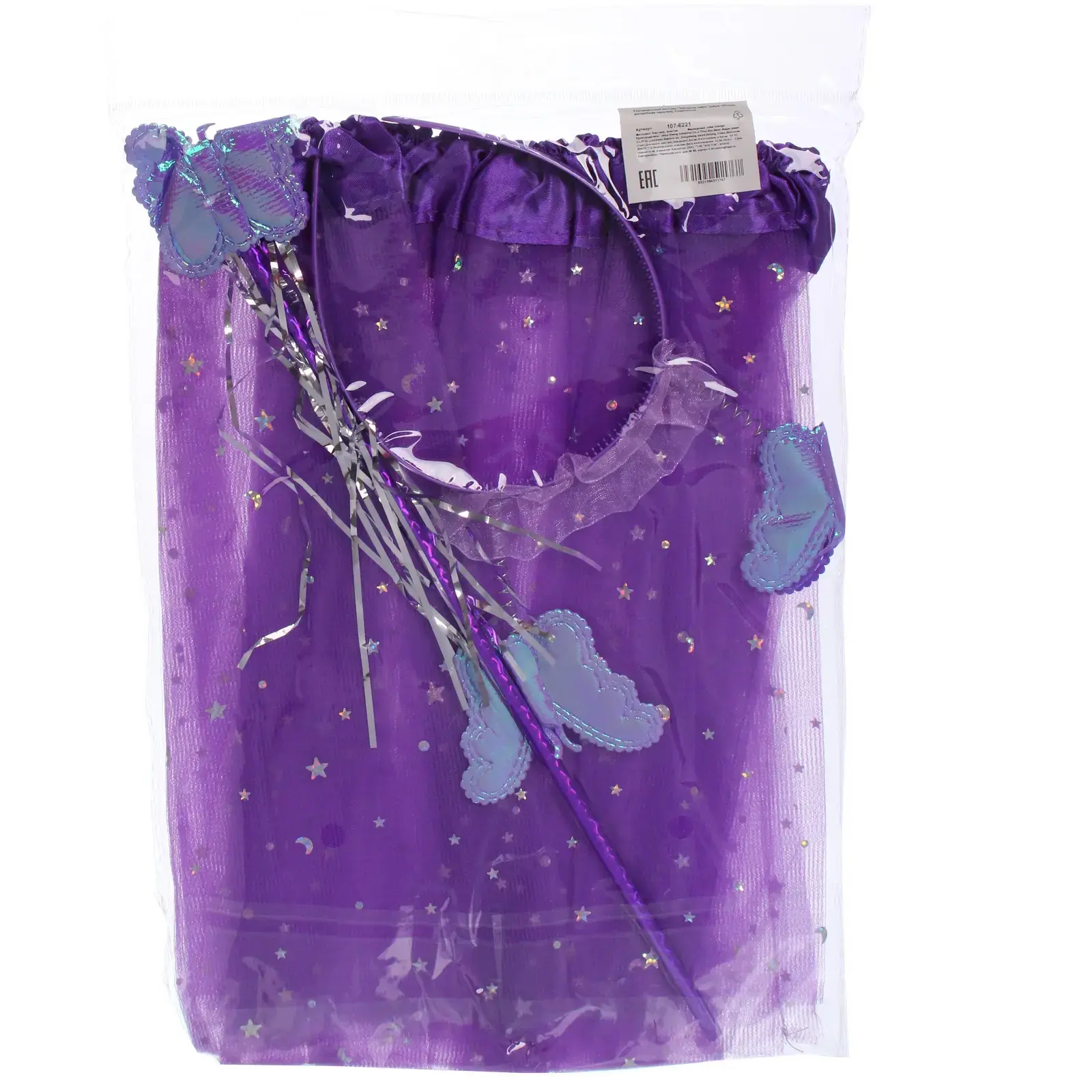 Комплектация включает: юбку-пачку из 7 слоев тюля, ободок с двумя объемными бабочками, волшебную палочку длиной 32 см. Все элементы упакованы в прозрачный пакет с перфорацией для демонстрации содержимого.