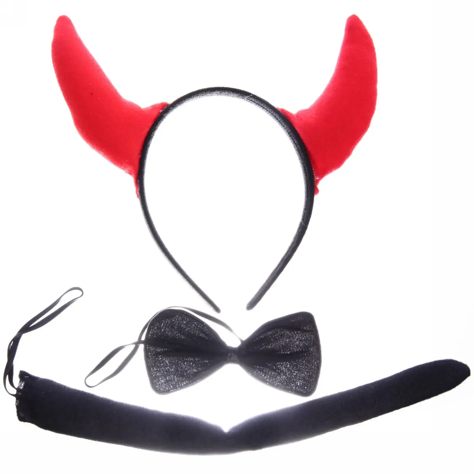 Ободок с рожками выполнен в черном цвете с красными рожками, которые мягкие и приятные на ощупь. Галстук-бабочка также черного цвета, что делает его универсальным аксессуаром. Хвостик, выполненный из текстиля, легко завязывается и подходит для ношения на талии. Все элементы набора имеют четкие линии и простую конструкцию, что делает их удобными в использовании.
