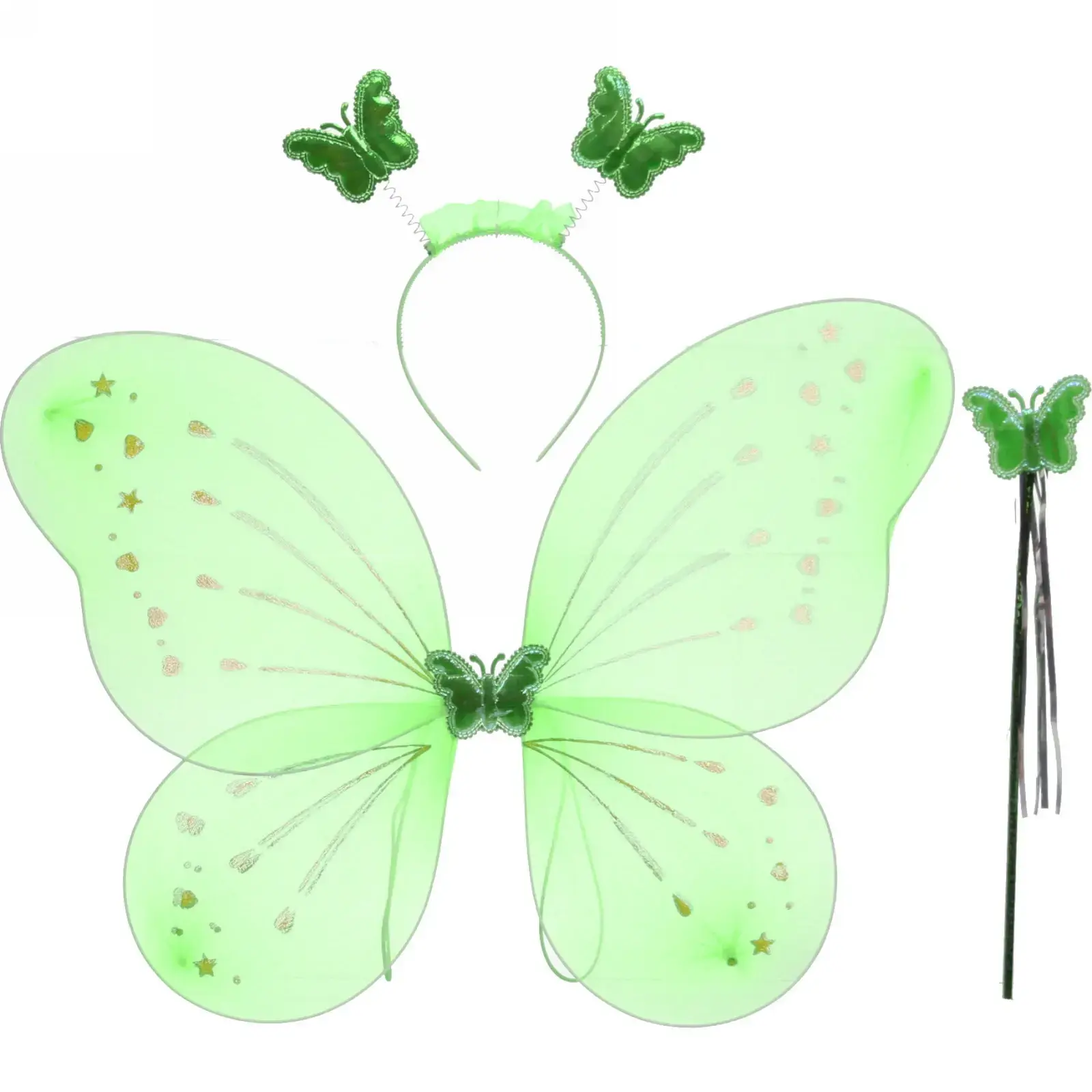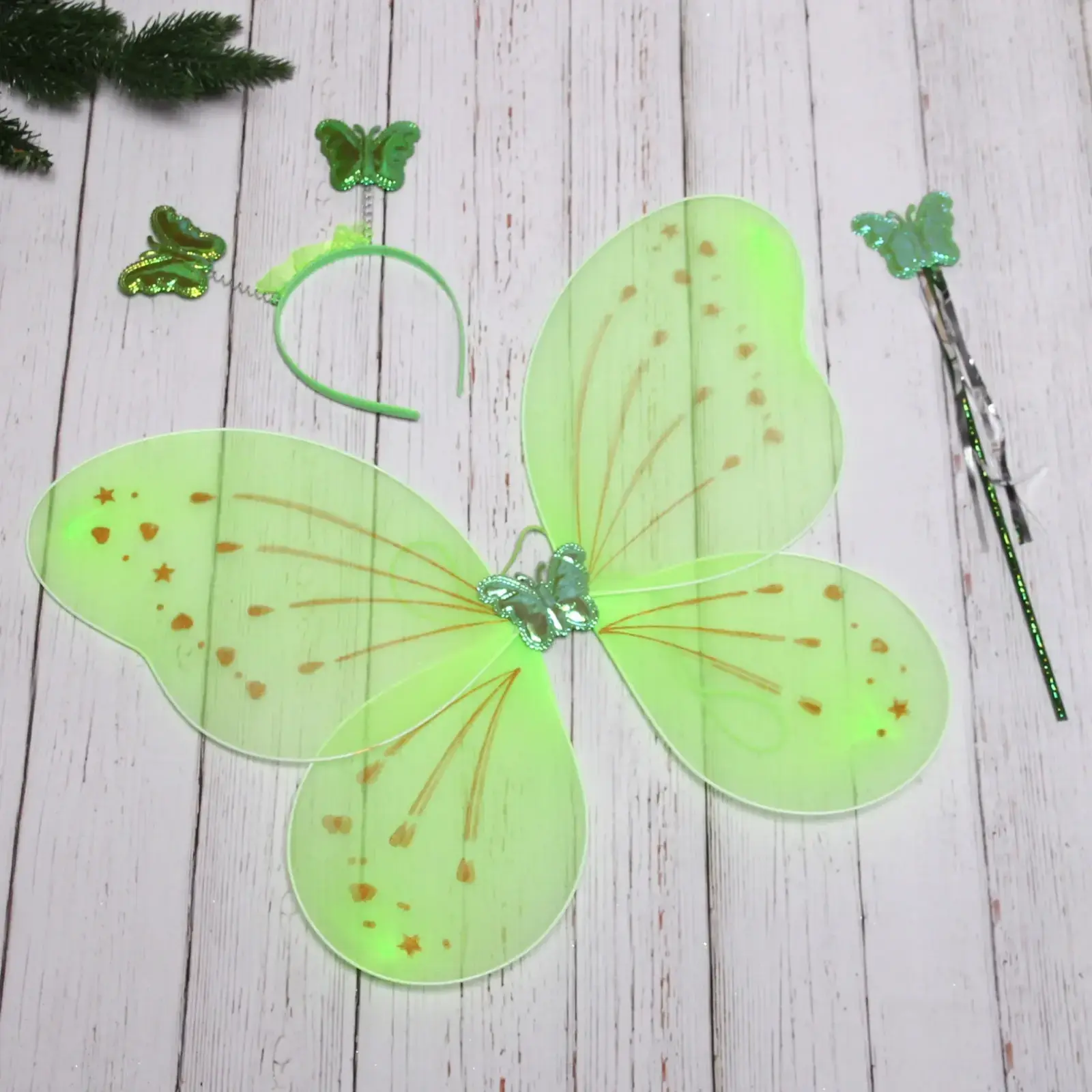 Крылья имеют прозрачную текстуру и украшены золотыми звездами, что придает им особую изюминку. Ободок и палочка также выполнены в зеленом цвете, что создает гармоничный образ. Этот набор станет отличным дополнением к любому костюму и поможет вам выделиться на празднике.