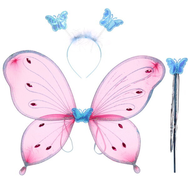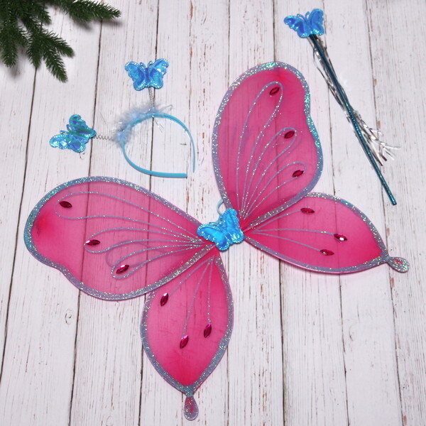 Крылья имеют розовый цвет с прозрачными элементами и декором в виде блестящих стразов, что добавляет им волшебства. Ободок украшен маленькими синими бабочками и фатиновыми элементами, а волшебная палочка отделана блестящими акцентами. Все элементы набора легкие и удобные, что делает их идеальными для длительного ношения.