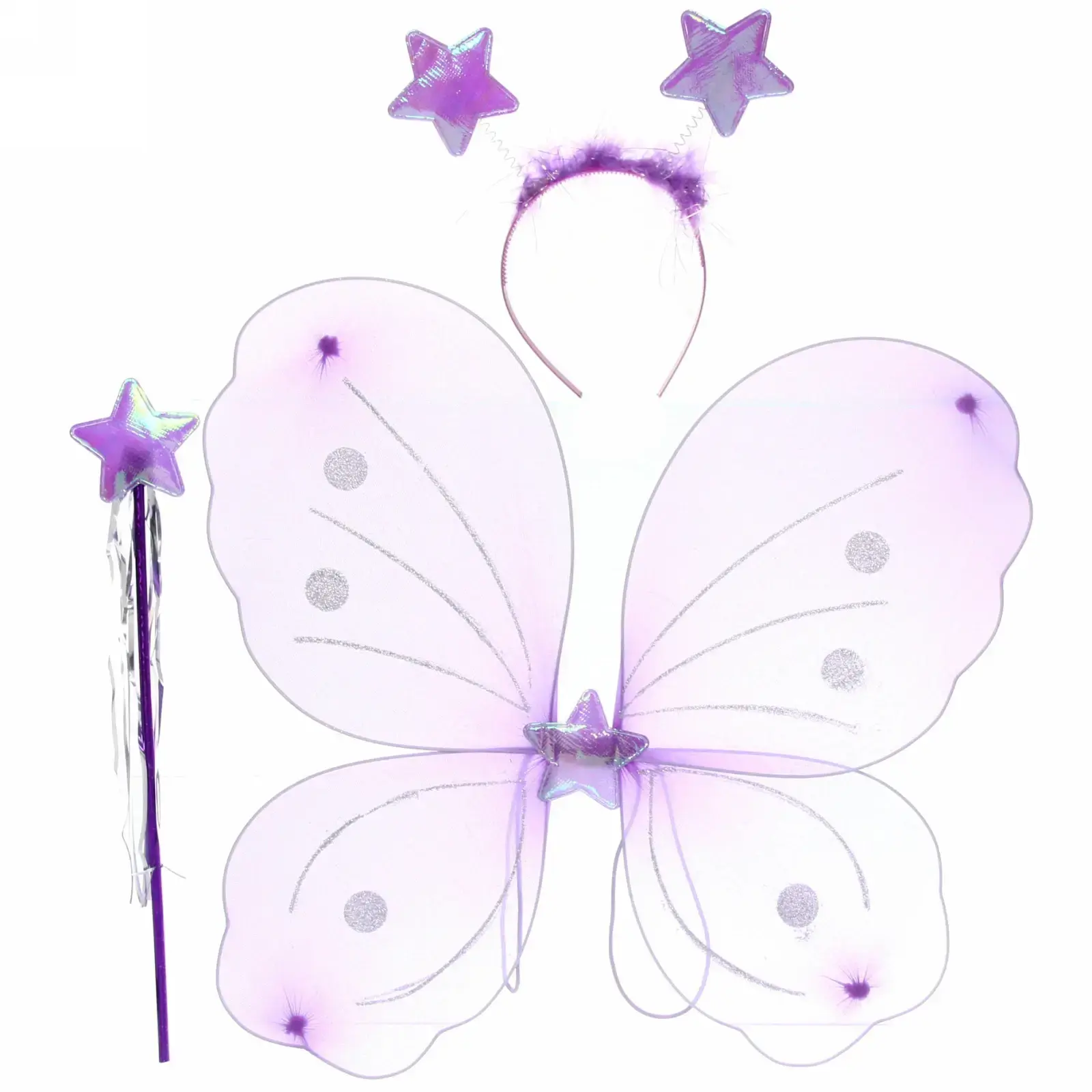 Набор включает в себя три элемента: крылья бабочки, ободок и палочку. Крылья выполнены из полупрозрачного материала с блестящими акцентами, что делает их легкими и воздушными. Ободок украшен мягкими волокнами и звездами, а палочка с блестящей звездой на конце добавляет завершающий штрих к образу. Этот набор подходит для детей младшего возраста и станет отличным дополнением к любому костюму.