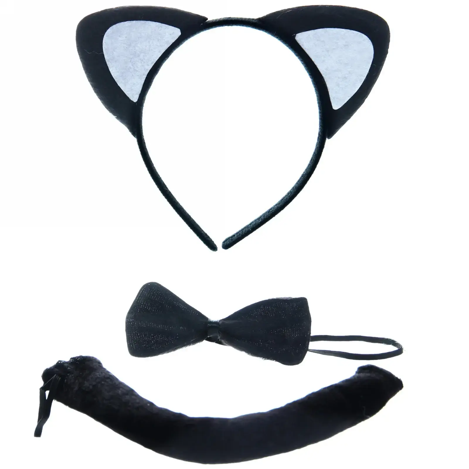 Ободок черного цвета с серыми ушками из фетра, бабочка выполнена из блестящего текстиля, а хвост — из мягкого материала. Все элементы набора имеют единый стиль и прекрасно дополняют друг друга, создавая гармоничный образ. Не упустите возможность порадовать себя или своих близких этим замечательным набором для карнавала!