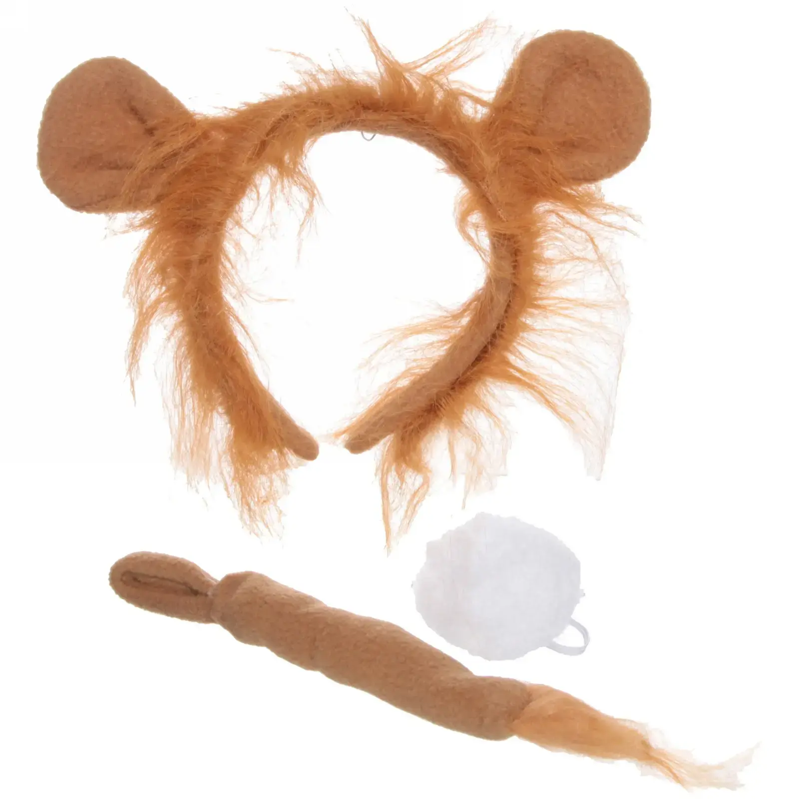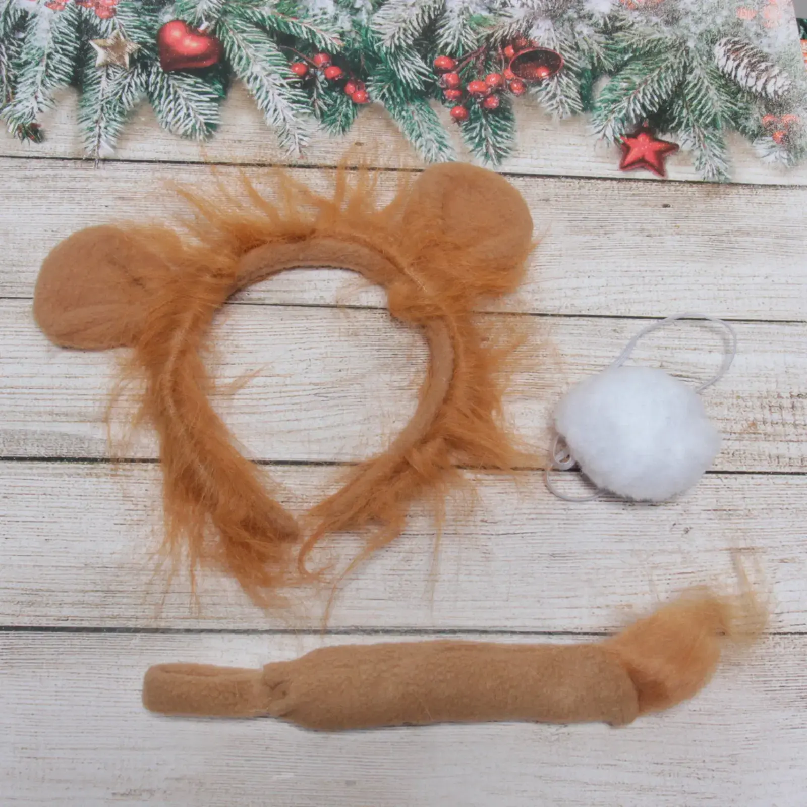 Основные элементы набора выполнены в светло-коричневом цвете с добавлением белого, что делает их универсальными для сочетания с другими костюмами. Ободок имеет округлую форму, а хвост — удлиненную с закругленным краем. Эти детали помогут вашему ребенку выглядеть как настоящий львенок, привнося радость и веселье в любой праздник.