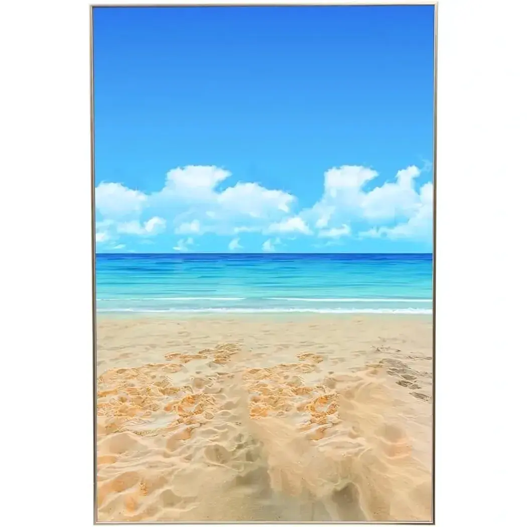 Рама прочная, ровная, с аккуратным соединением углов. Картина упакована в защитную термоусадочную плёнку, что предохраняет поверхность во время транспортировки. Крепёжные элементы позволяют быстро повесить картину на стену, а компактный формат удобен для небольших пространств. Пейзаж с отпечатками шагов на песке добавляет работе индивидуальности и делает её живой и тёплой.