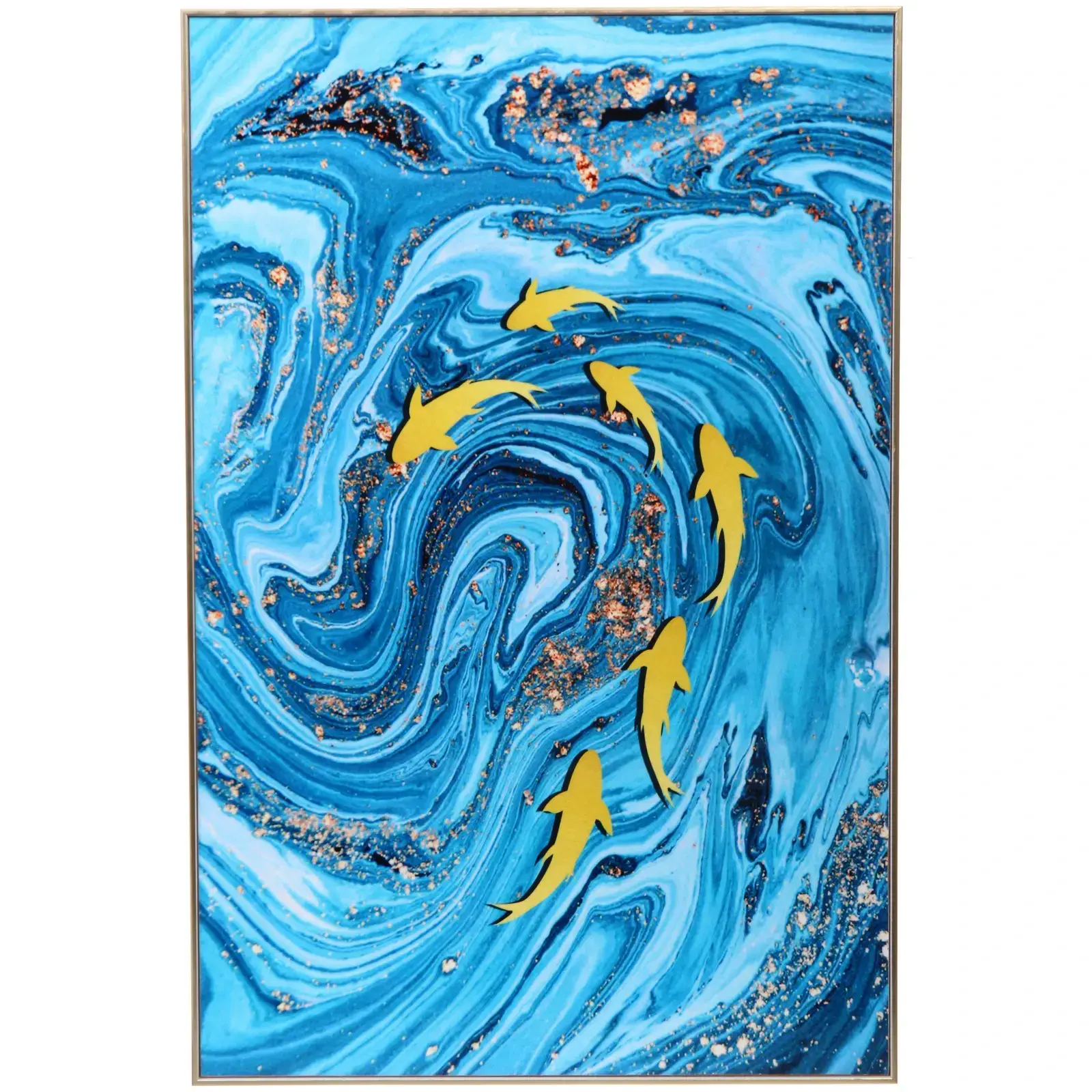 Рекомендуется крепить на стену с помощью простых крепежных элементов, предусмотренных в комплекте. Это изделие отлично сочетается с другими произведениями искусства или декоративными элементами, подчеркивая индивидуальность вашего пространства. С декоративной точки зрения, изображение с золотыми рыбками и синим мраморным фоном добавит свежести и уникальности вашему интерьеру.