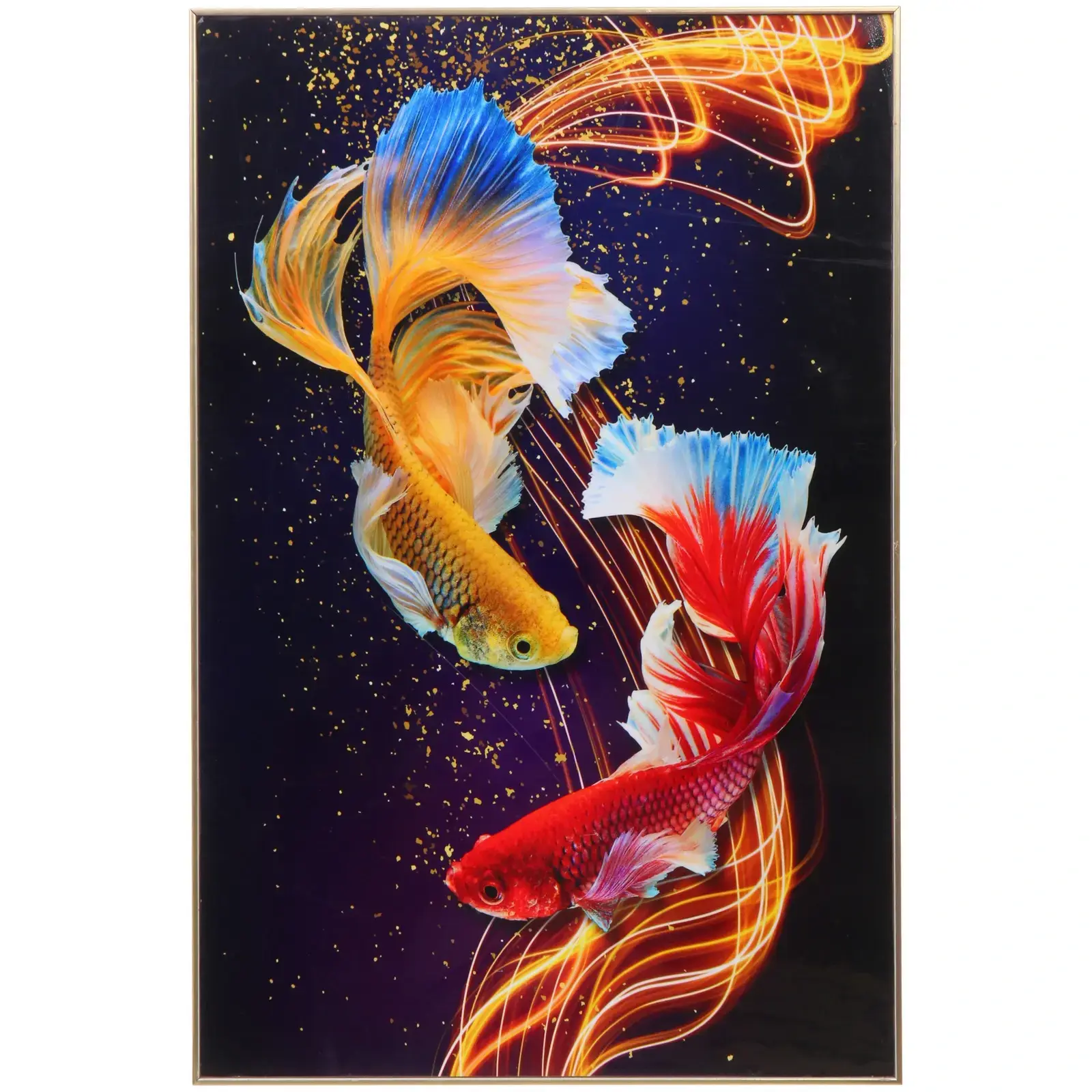 Эта картина выполнена из качественных материалов: бумага, ДСП и пластик обеспечивают долговечность и устойчивость к внешним воздействиям. Яркие цвета рыбок на тёмном фоне создают эффект движения и света, что делает картину особенно привлекательной. Кроме того, термоусадочная пленка защищает изображение от повреждений и выцветания, что гарантирует долгий срок службы.