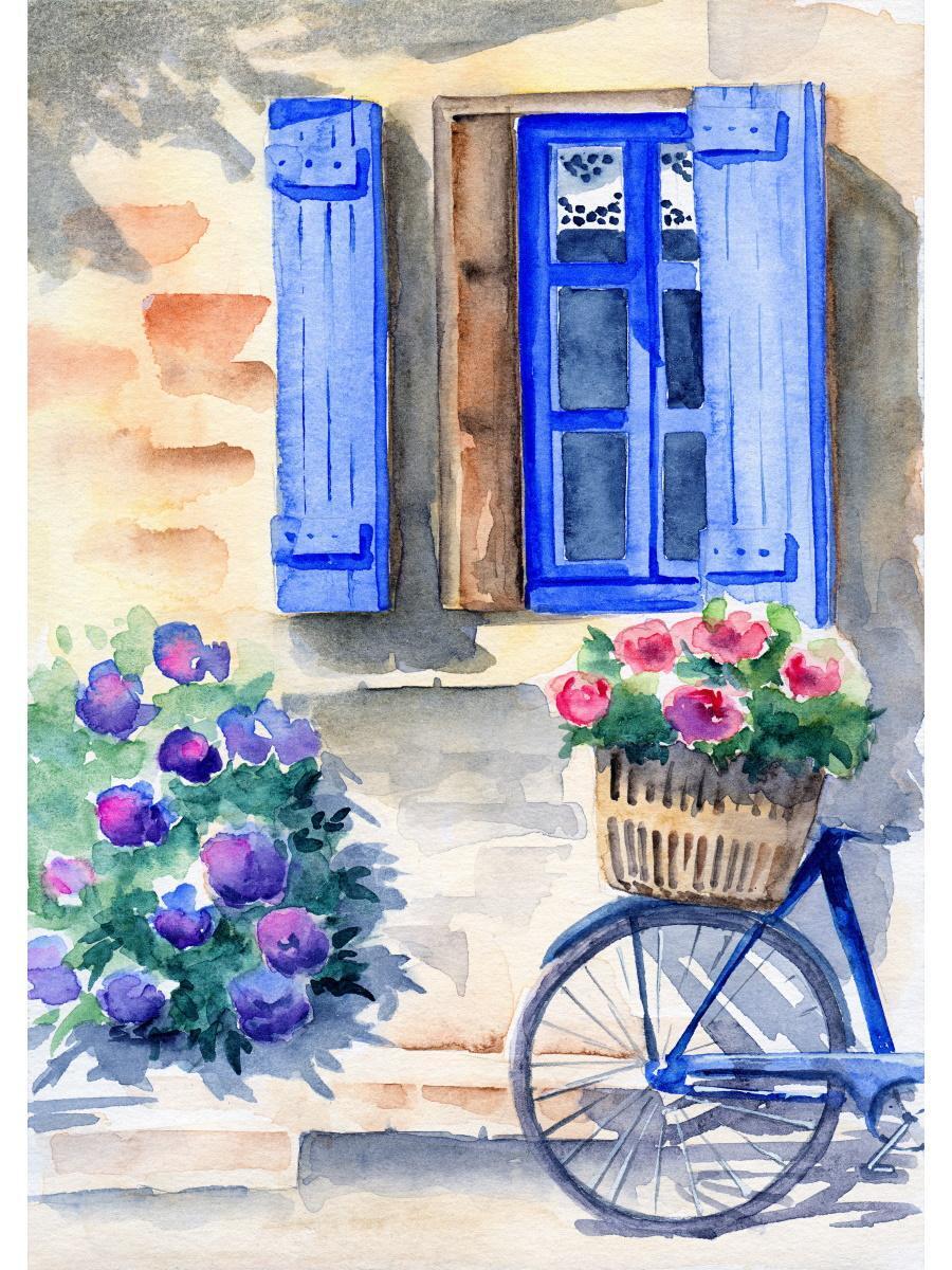 Готовая работа станет прекрасным украшением интерьера в стиле прованс или оригинальным подарком для близких. Сюжет с голубыми ставнями и цветами создает атмосферу уюта и безмятежности.