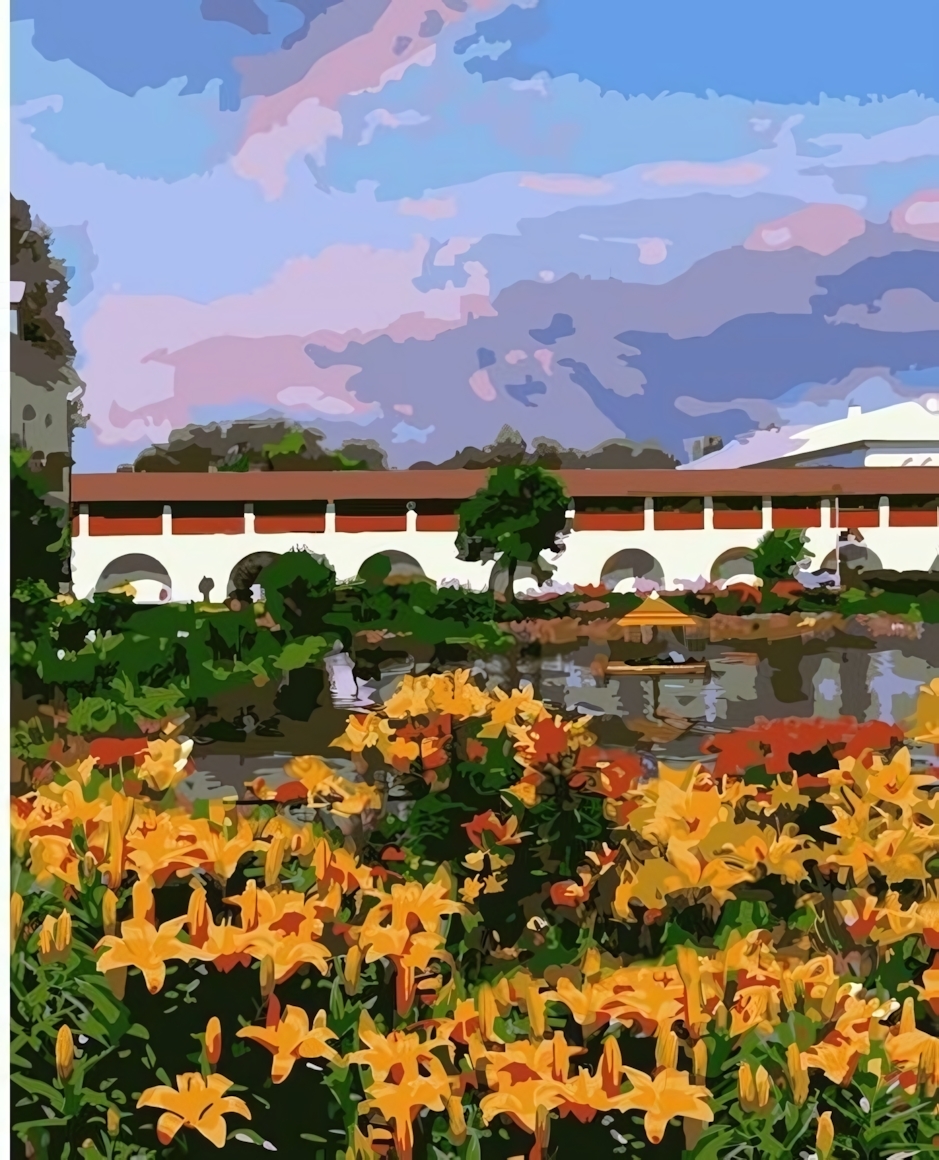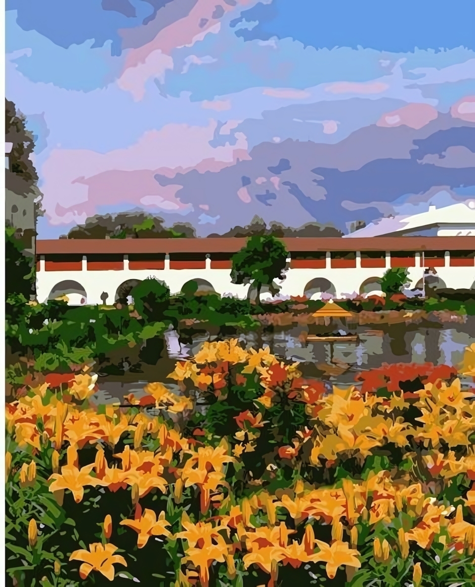 Погрузитесь в мир творчества и создайте прекрасную картину своими руками! Этот набор – идеальный способ расслабиться, развить художественные навыки и украсить свой дом уникальным произведением искусства. Насладитесь процессом создания живописного пейзажа, изображающего фасад строения с арочной стеной и крышей, окруженного зеленью и отражениями в воде.