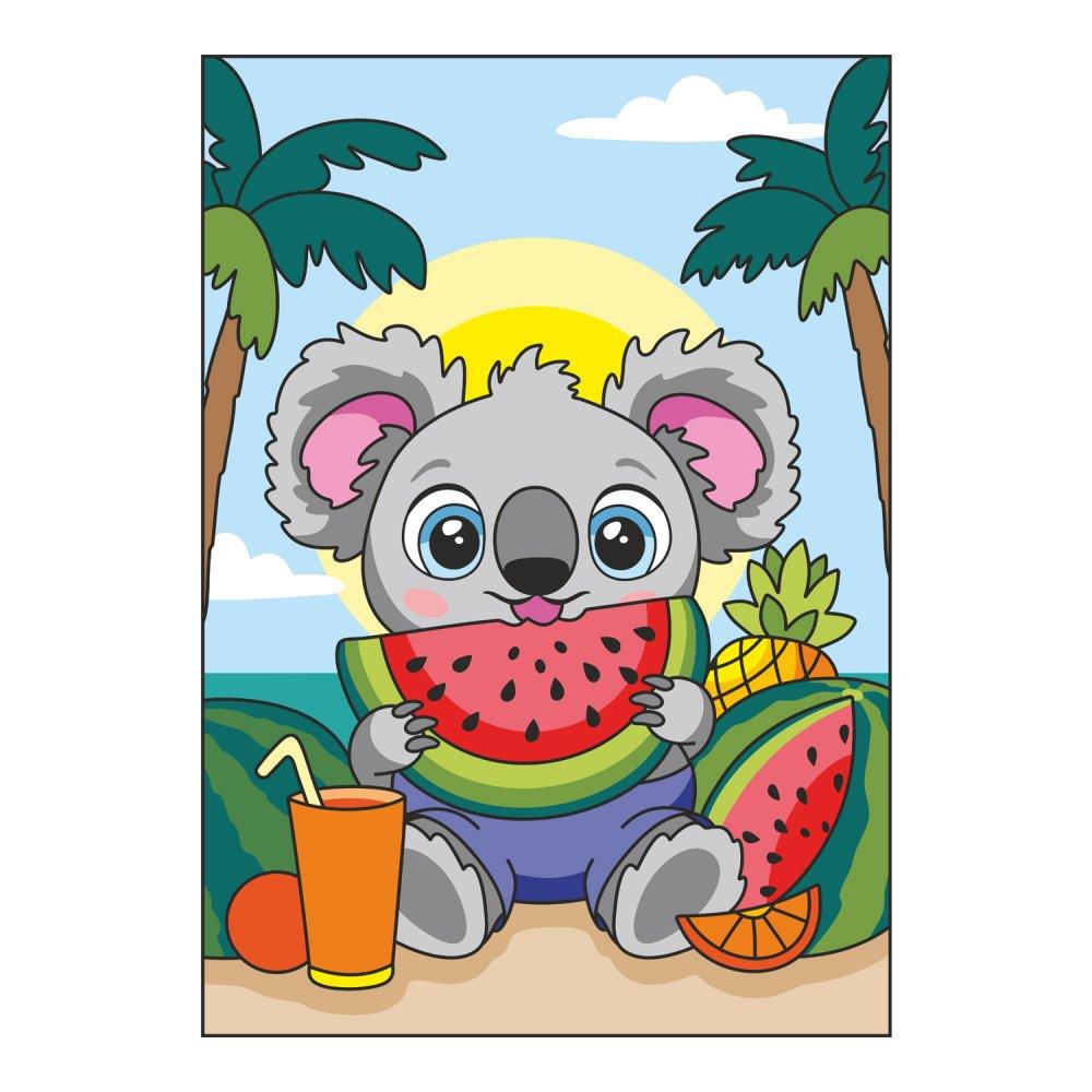 Милый мультяшный коала отдыхает на солнечном пляже, наслаждаясь сочным ломтиком арбуза. Веселая композиция дополнена другими тропическими фруктами, пальмами и лазурным морем. Яркая и добрая сцена обязательно понравится ребенку и вдохновит на творчество.