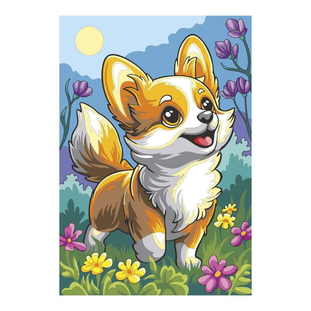 Размер готовой картины составляет 20 на 30 сантиметров — это оптимальный формат для детской комнаты. Сюжет с дружелюбным щенком корги и красочным летним лугом создаёт позитивное, тёплое настроение. Набор предназначен для детей, но может стать приятным хобби и для взрослых, делающих первые шаги в рисовании. Это замечательный подарок на день рождения, Новый год или просто без повода, чтобы порадовать вашего маленького творца.