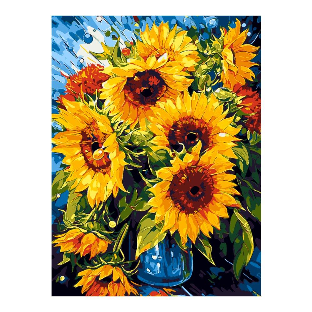 В центре композиции — пышный букет крупных, жизнерадостных подсолнухов в вазе. Лепестки написаны сочными мазками жёлтого и оранжевого, а сердцевины цветов — тёплыми коричневыми оттенками. Зелёная листва обрамляет букет, а фон выполнен в спокойных сине-голубых тонах с абстрактными мазками, что добавляет картине глубины и художественной выразительности. Готовую работу можно покрыть лаком из набора для блеска и защиты, а затем оформить в рамку.