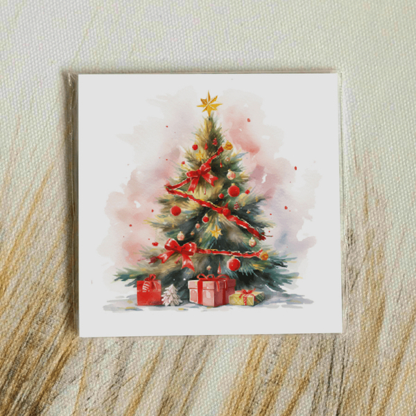 Эта яркая и красочная карточка станет отличным дополнением к вашему новогоднему декору. Она выполнена в акварельной технике, что придаёт ей уникальный и живописный вид. С изображением рождественской ёлки, украшенной красными шариками, лентами и звездой на верхушке, карточка создаёт ощущение уюта и радости. Подарите себе и своим близким частичку волшебства в этот праздничный сезон!