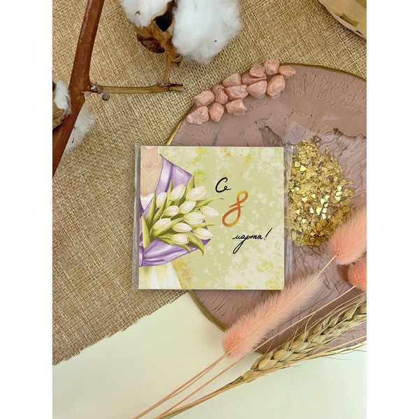 Открытка подходит для поздравления на Международный женский день, а также для других торжественных случаев. Она легко помещается в конверт стандартного размера, что делает её удобной для отправки по почте или вручения лично. Размер открытки составляет 15х10 см, что позволяет разместить на ней достаточно места для ваших теплых слов и пожеланий.