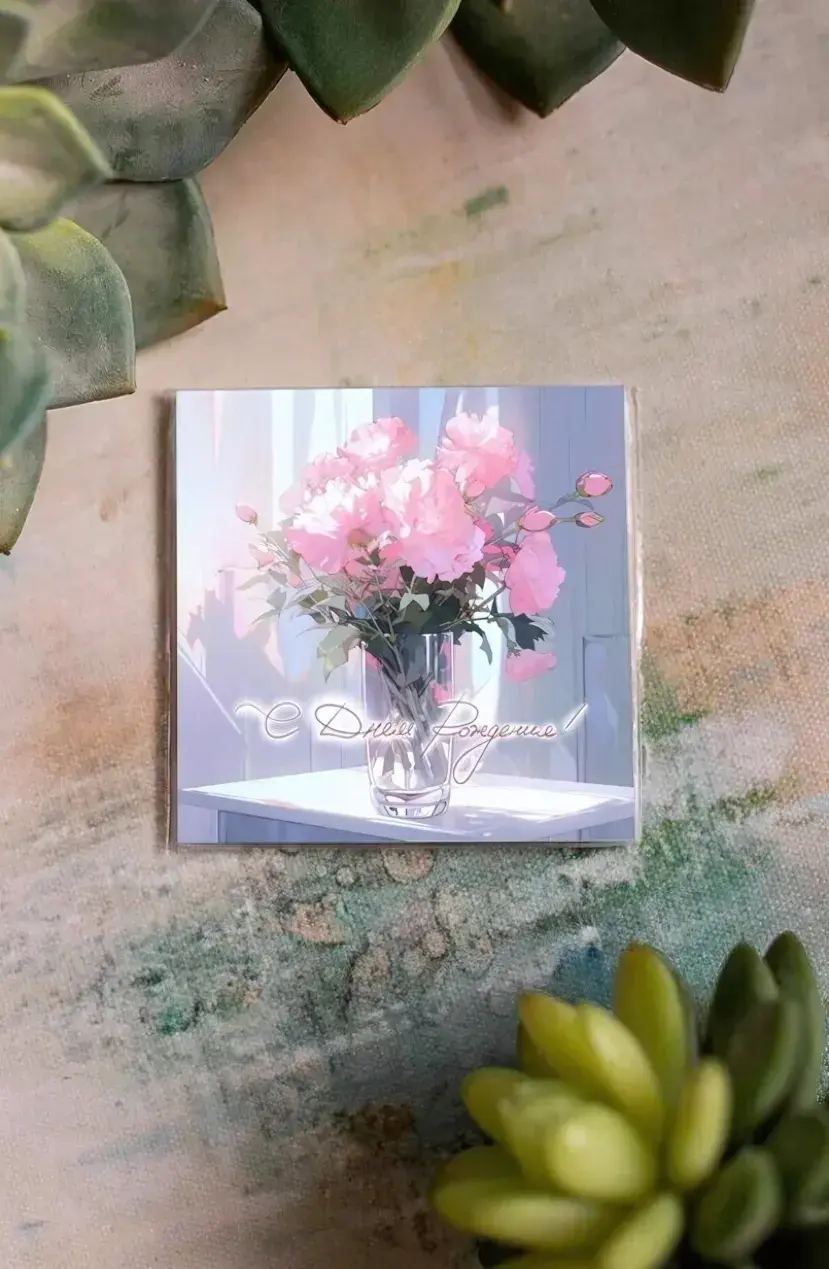 Превратите обычный подарок в трогательный жест с квадратной открыткой в пастельных тонах. Изысканная иллюстрация пионов в стеклянной вазе создает атмосферу нежности, а каллиграфическая надпись добавляет праздничного шарма.