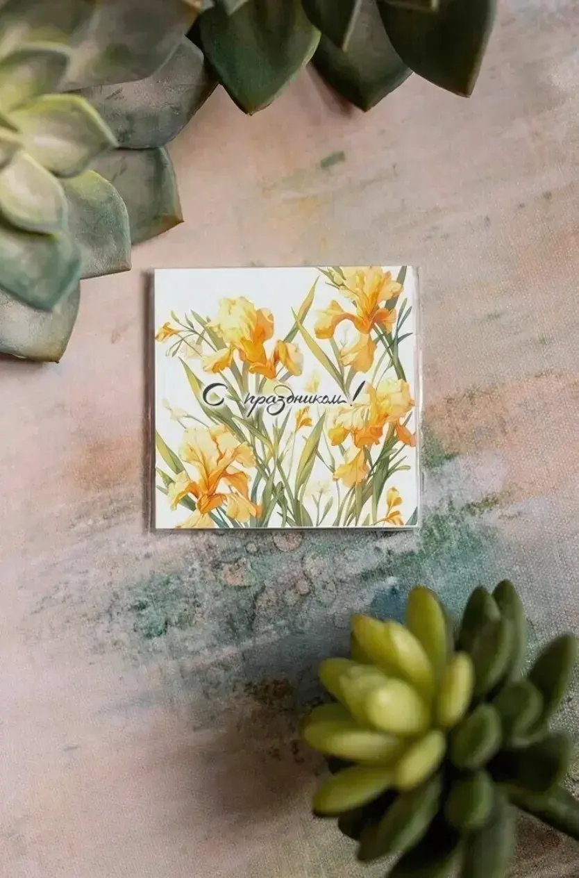 Подарите частичку тепла с открыткой 'С Праздником!' K326. Нежные ирисы в акварельной технике создают атмосферу заботы и внимания.