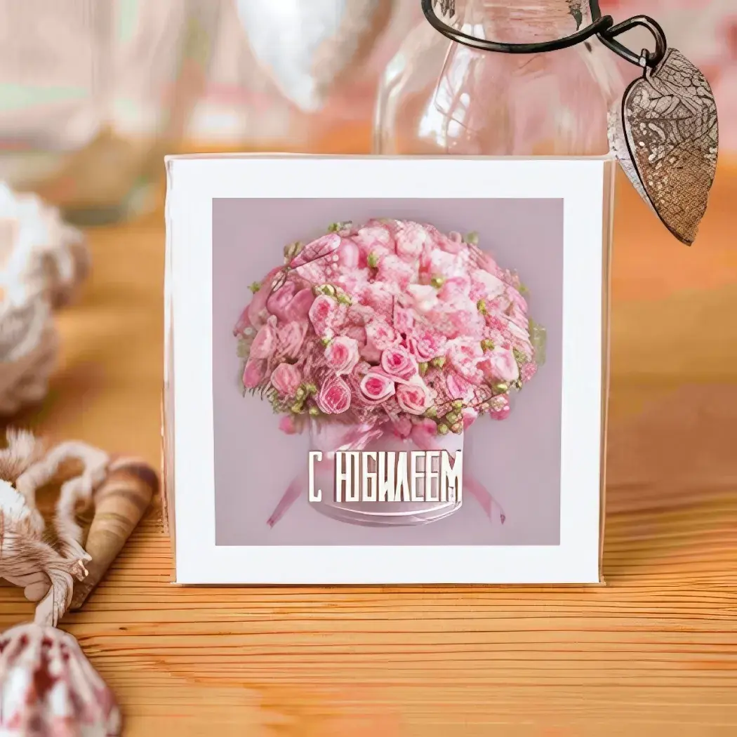 Открытка юбилейная с объемными цветами, розовый, зеленый, картон, белая рамка, 15х15см