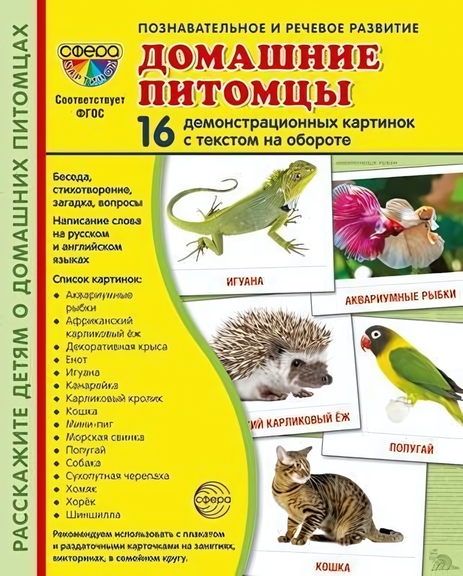 - 16 демонстрационных карточек с красочными изображениями домашних животных.
