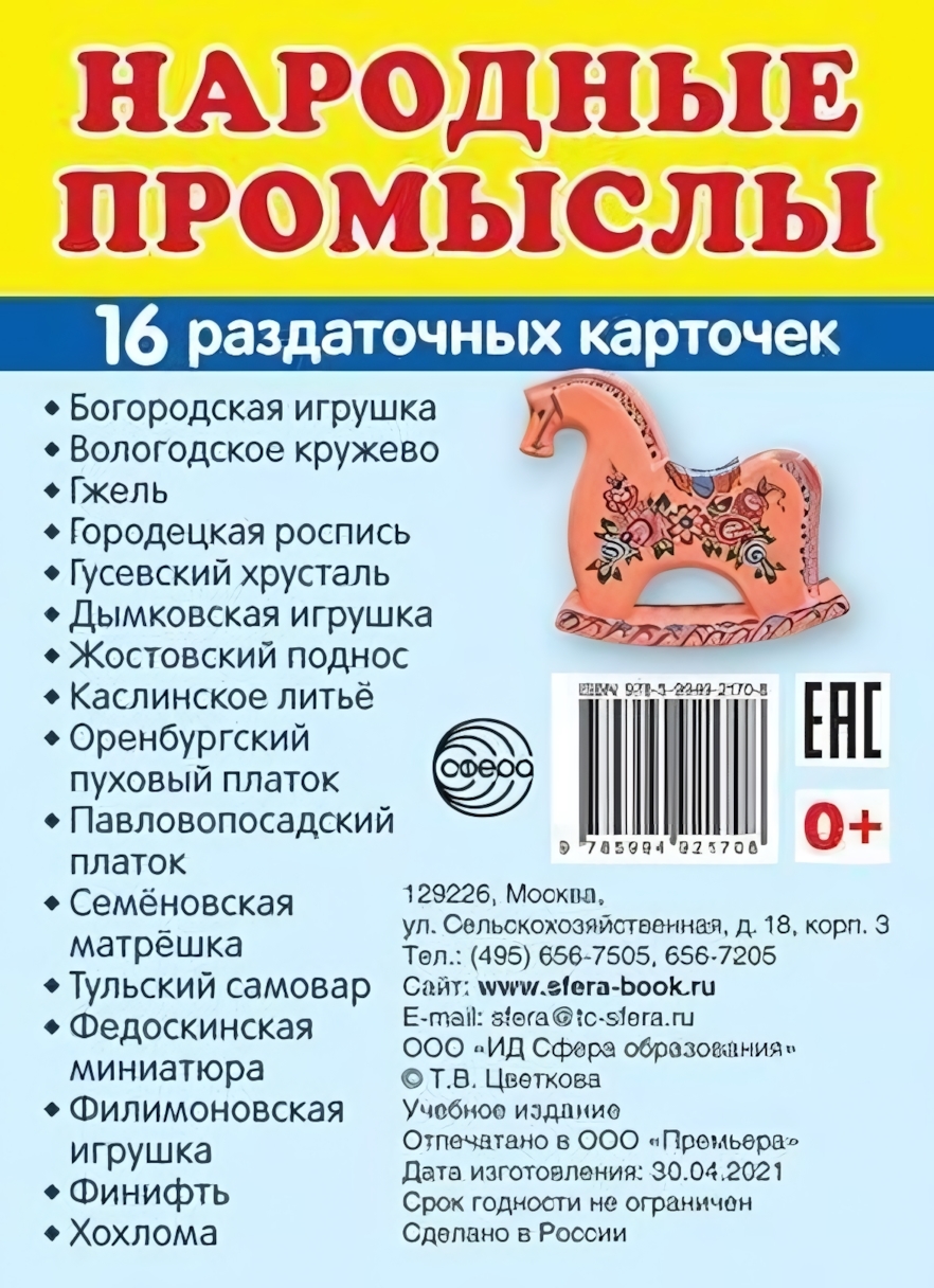 Набор из 16 развивающих карточек создан для увлекательного изучения традиционных промыслов России. Яркие иллюстрации и двуязычные подписи развивают память, расширяют кругозор и стимулируют интерес к родной истории.