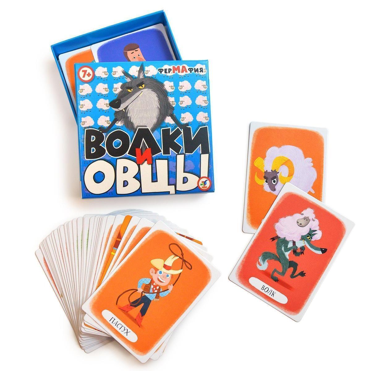 Коробка игры выполнена в ярких цветах с изображением волка, что привлекает внимание. Внутри вы найдете игровые карты с красочными персонажами, такими как пастух, волк и овцы. Игра подходит для 3-10 игроков, что делает её отличным выбором для семейных вечеров или дружеских встреч.
