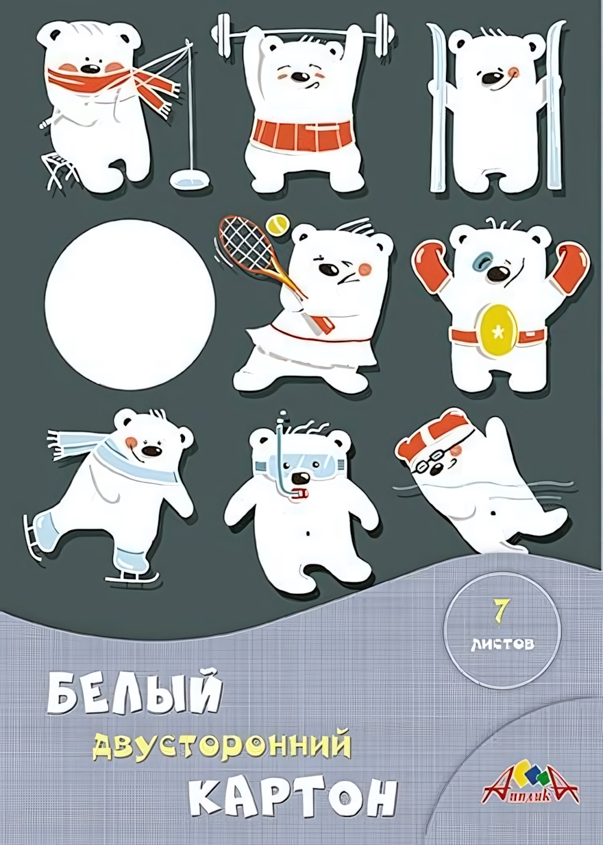 Картон мелованный двусторонний «Белые медвежата» А4, 7 листов в папке, для детского творчества