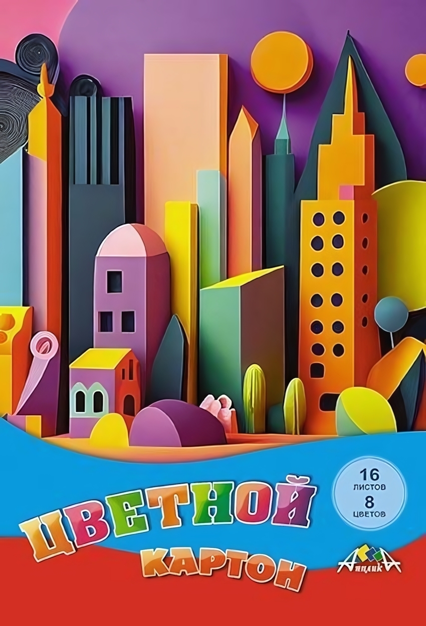 Картон цветной «Цветной город» А4, 16 листов, 8 цветов, немелованный, в папке