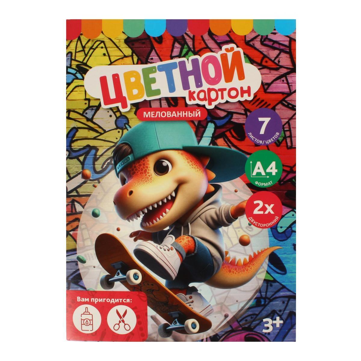 Картон цветной мелованный двусторонний А4 7л/7цв «Динозаврик на скейте» в папке для творчества