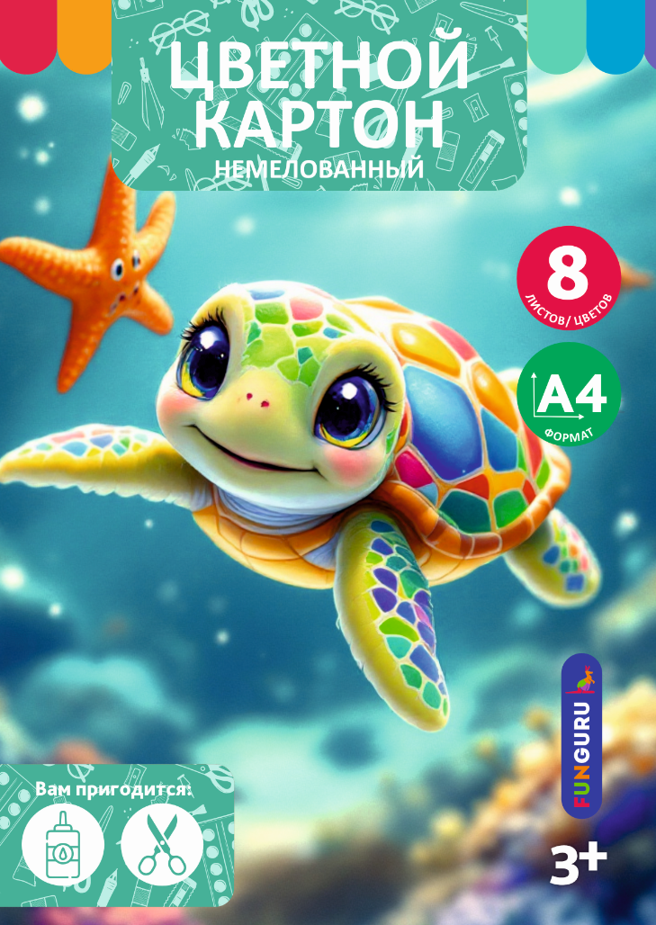 Картон цветной А4, 8 листов/8 цветов, немелованный, серия 'Черепашка', в папке