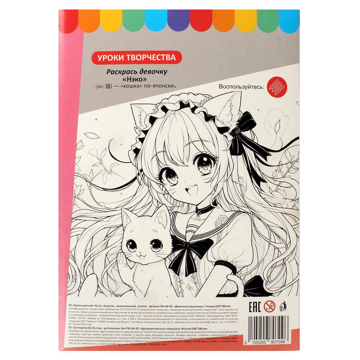 Цветной картон А4, 8 цветов, немелованный, серия "Девочка в наушниках", для детского творчества