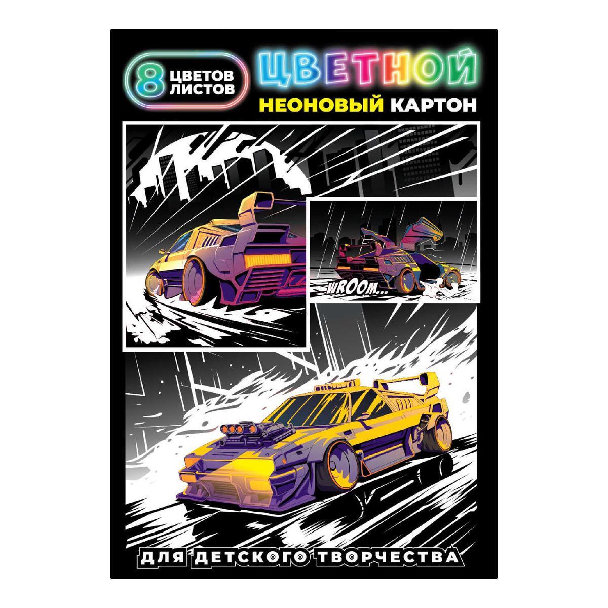 Цветной картон А4, неоновые 8 цветов, 8 листов, коллекция 'Гонки'