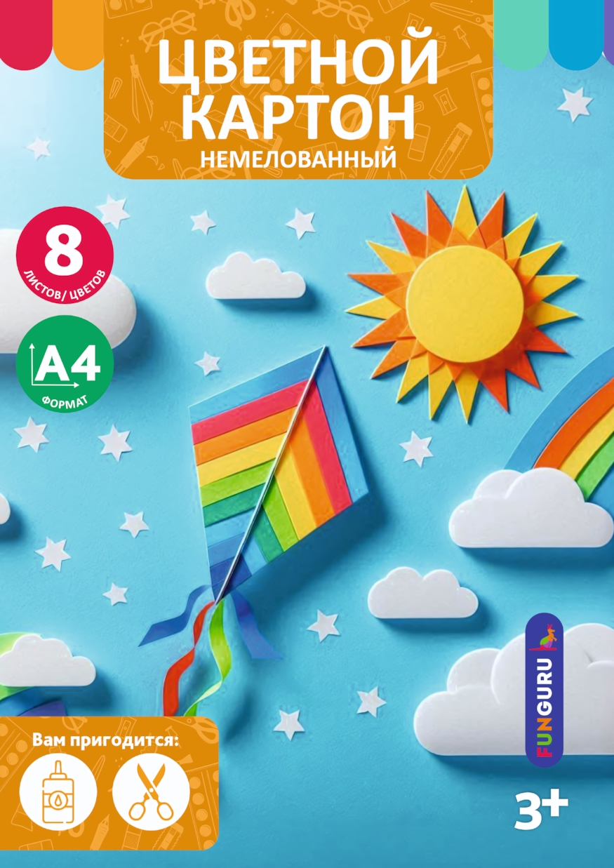 Картон цветной А4 "Воздушный змей" 8л 8цв немелованный в папке