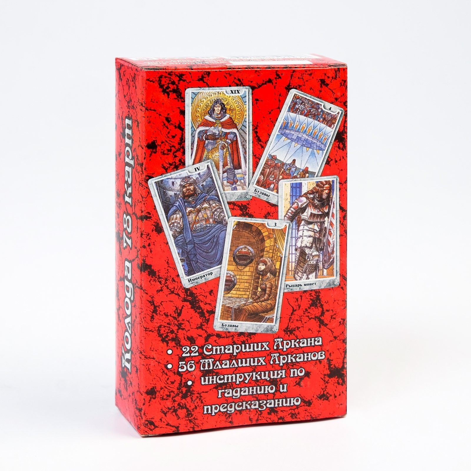 Каждая карта имеет стандартный размер и прямоугольную форму, что делает их удобными для использования. Коробка, в которой хранятся карты, выполнена в красном цвете с красивыми иллюстрациями, что делает её стильным дополнением к вашему интерьеру. Эти карты станут не только инструментом для предсказаний, но и оригинальным элементом декора.