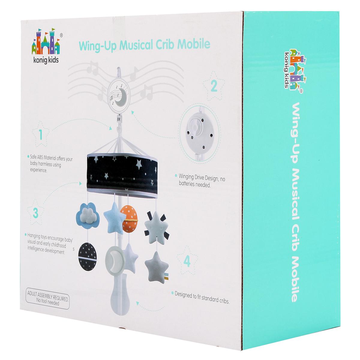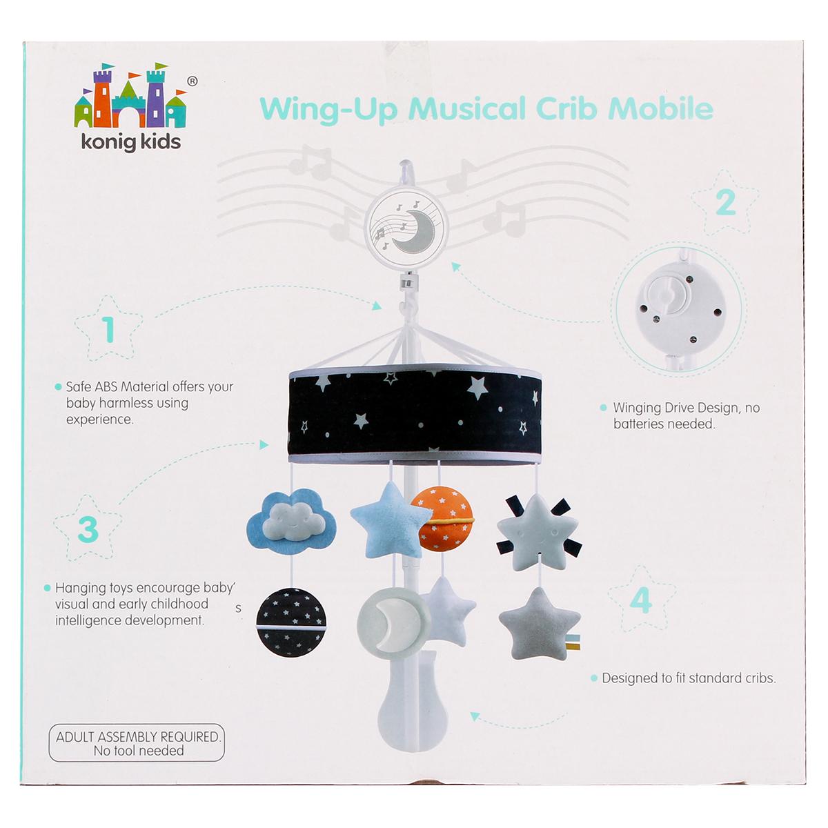 Карусель включает в себя музыкальную шкатулку, кронштейн, четыре подвесных игрушки и крестовину для подвешивания. Все материалы, использованные в производстве, безопасны для детей. Размеры карусели компактны, что позволяет удобно разместить её над кроваткой. Необходима сборка взрослым, инструменты не требуются.