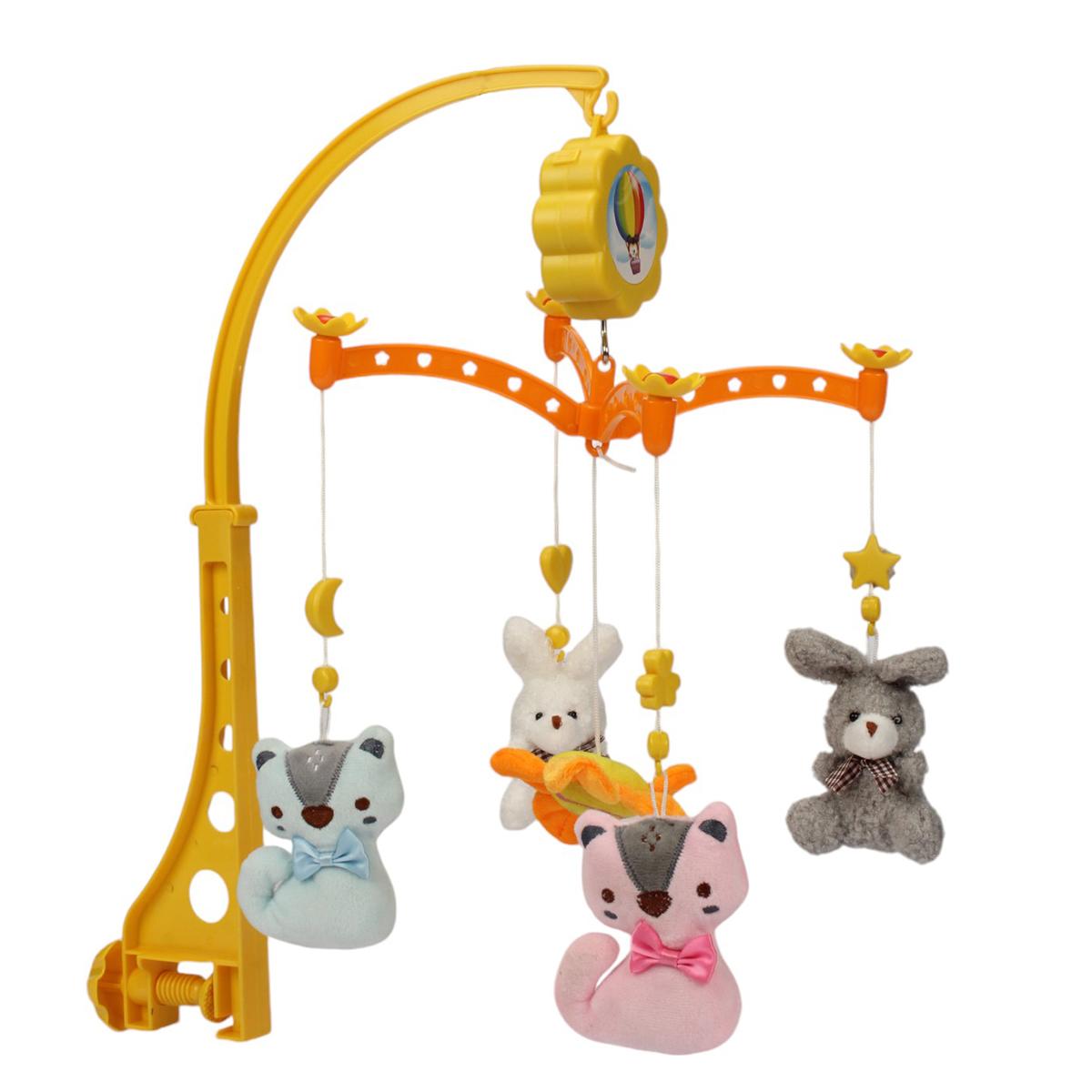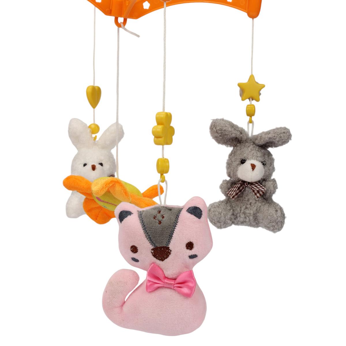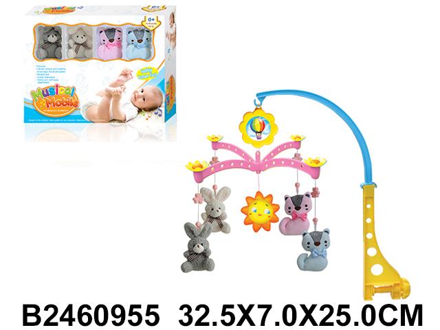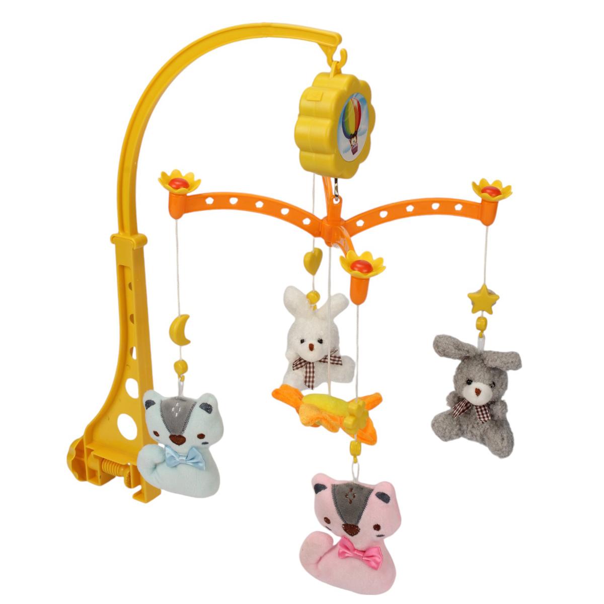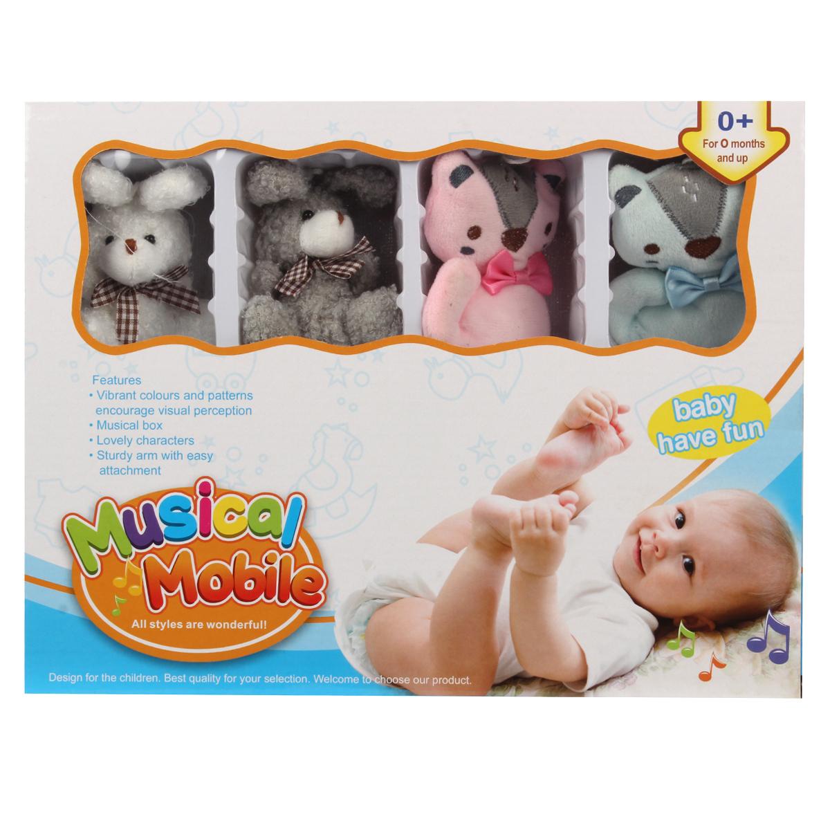 Игровая мобильная конструкция включает в себя мягкие, безопасные игрушки в виде животных — зайчика, медвежонка, лисички и уточки, выполненные из гипоаллергенных материалов. Моторчик внутри проигрывает мягкую музыку, вызывающую спокойствие и приятные эмоции у малыша. Размер мобильного устройства — 47 см, материал — пластик, что обеспечивает длительную надежность и легкость в уходе.