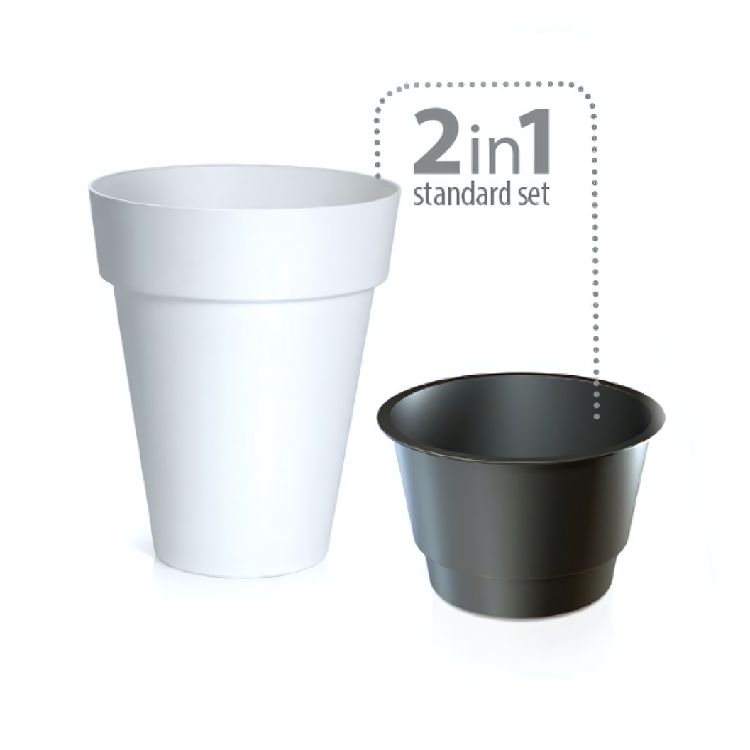 Диаметр изделия — 27,6 см, высота — 34,9 см. Объем — 8/12 л. Кашпо выполнено из прочного пластика в белом цвете. В комплект входит внешний декоративный корпус и внутренний технологический горшок.