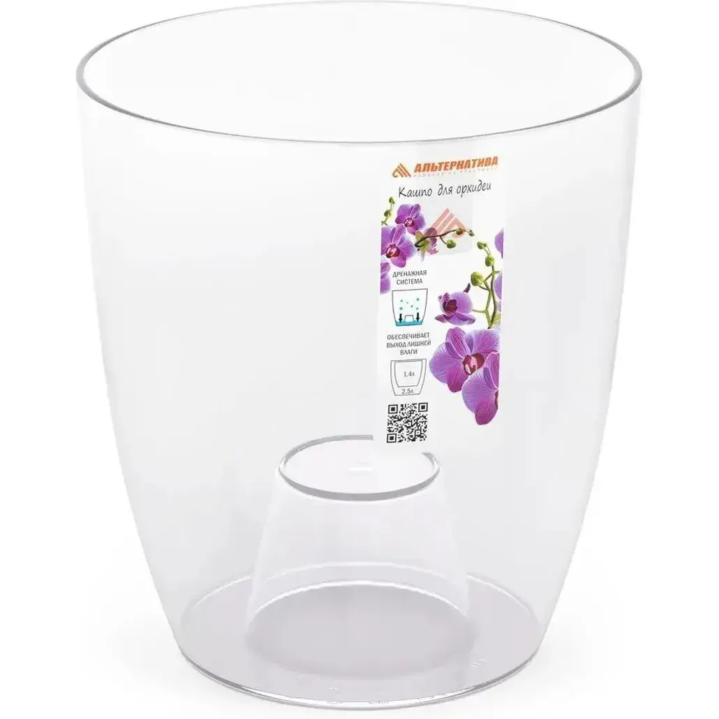 Изготовленное из прочного прозрачного пластика кашпо позволяет визуально контролировать состояние корневой системы. Диаметр 160 мм и объем 2,5 л подходят для большинства видов фаленопсисов и дендробиумов. Легкий вес (всего 190 г) упрощает перемещение растений.