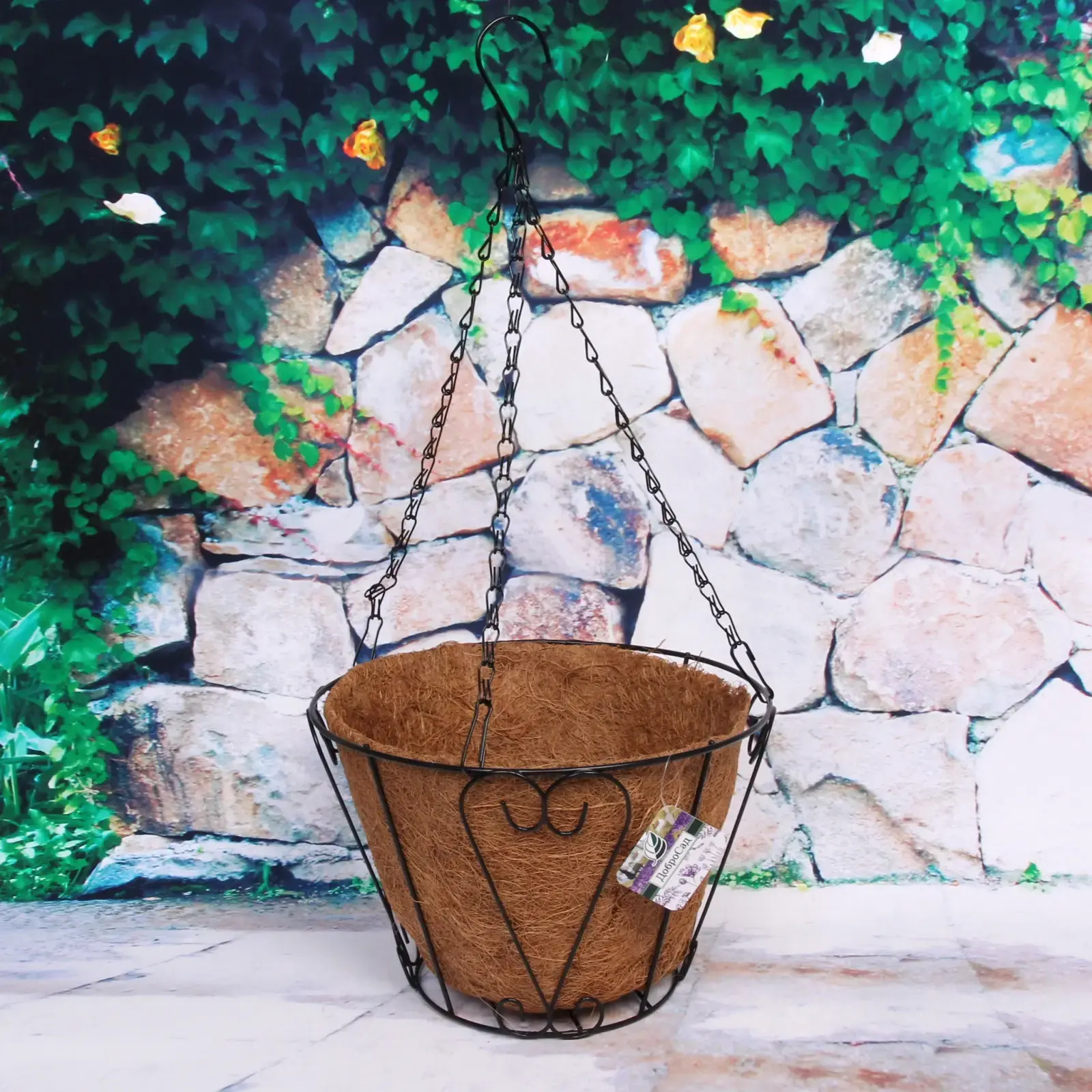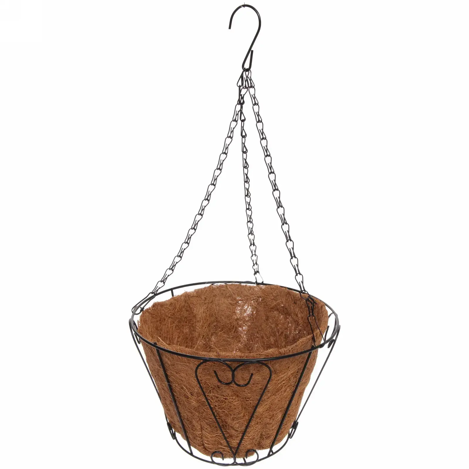 Кашпо изготовлено из высококачественных материалов: прочного металла черного цвета и натурального кокосового волокна коричневого оттенка. Коническая форма обеспечивает удобство использования и эстетичный внешний вид.