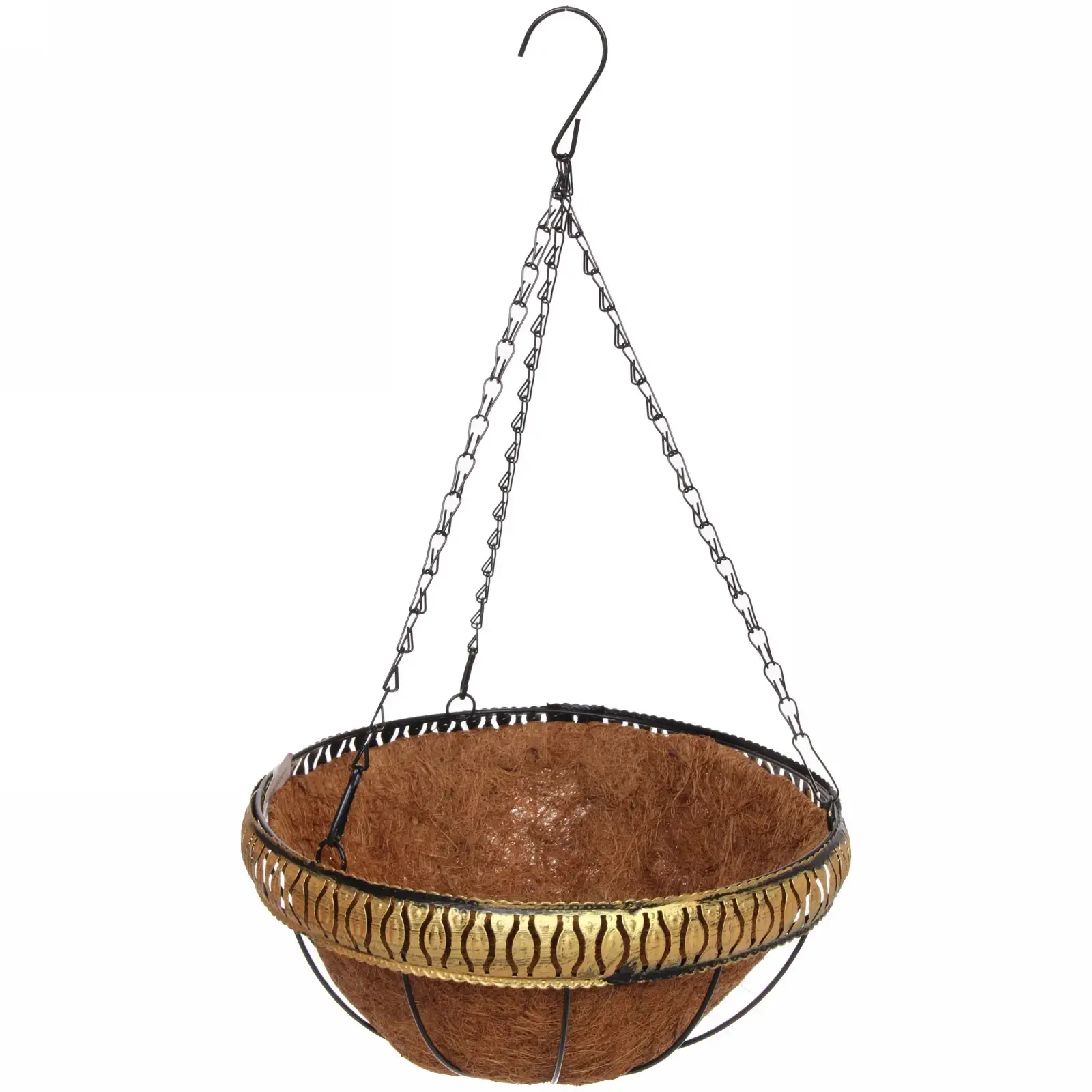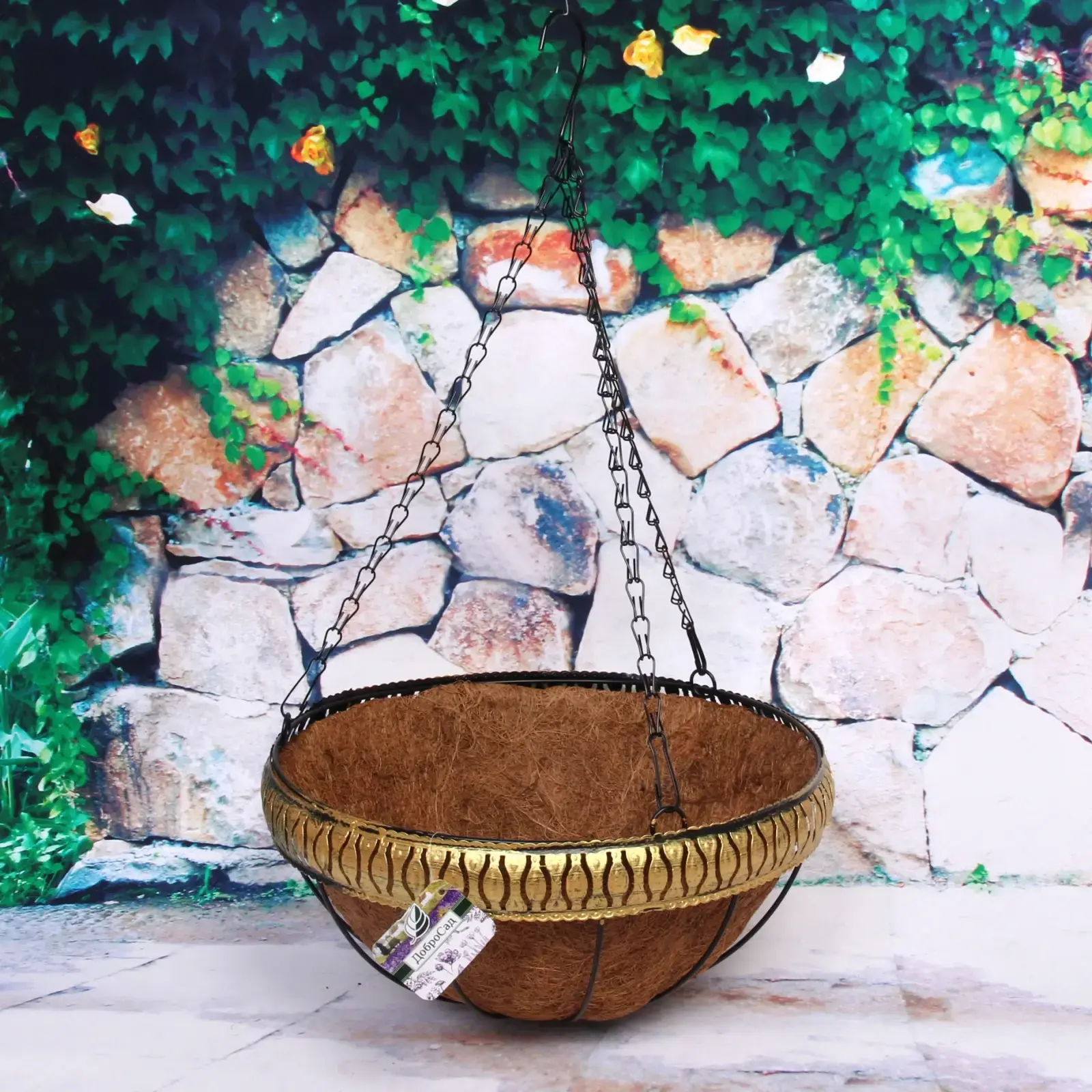Кашпо имеет округлую форму и плоское дно, что обеспечивает стабильность при подвешивании. Внутренняя часть заполнена кокосовым волокном, которое удерживает влагу и способствует здоровому росту растений. Размеры кашпо делают его универсальным для различных видов растений, а стильный дизайн добавляет шарм любому интерьеру.