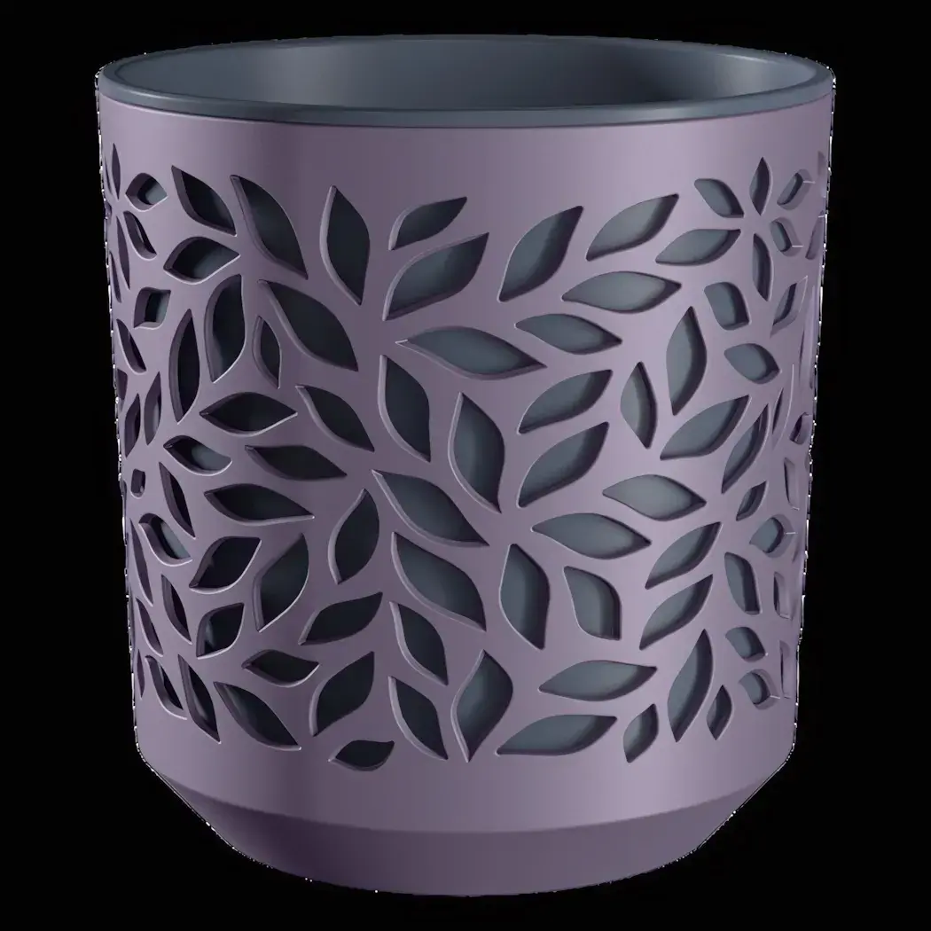 Кашпо имеет объем 1,25 литра и диаметр 16,2 см, что позволяет использовать его для различных растений. Его цилиндрическая форма и резные элементы в виде листьев придают ему эстетическую привлекательность, а темная внутренняя часть контрастирует с ярким внешним цветом, создавая эффект просвечивания при освещении.