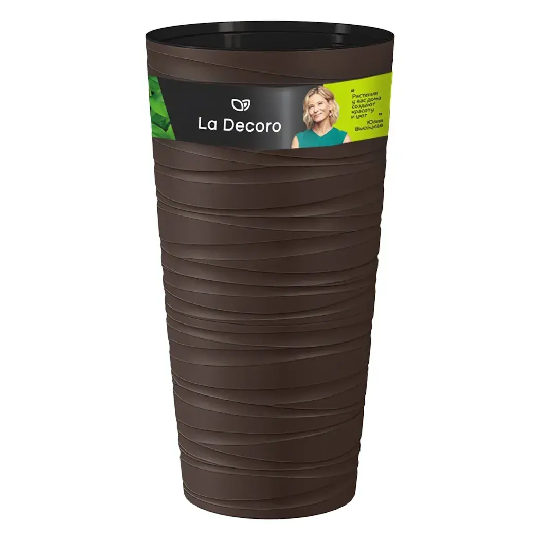 Кашпо выполнено из качественного пластика, что гарантирует его долговечность и устойчивость к повреждениям. Размеры: объем 15 литров, диаметр 30 см. Темно-коричневый цвет с черной верхней частью придает ему стильный вид, а рельефный дизайн добавляет оригинальности. Это кашпо станет отличным дополнением к вашему саду или интерьеру.