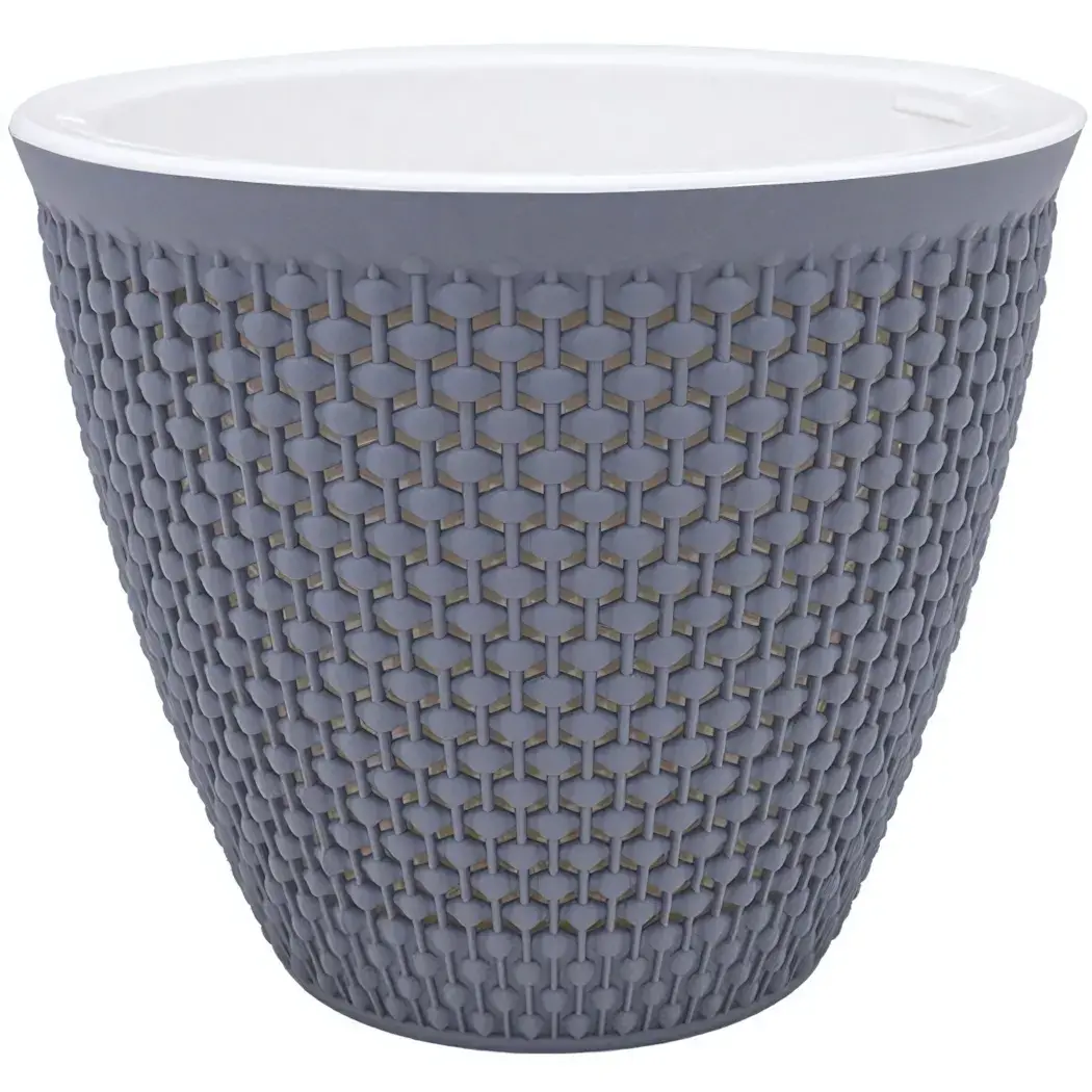 Кашпо выполнено из прочного пластика, что обеспечивает его долговечность и легкость. Серый цвет и текстурированная поверхность придают ему стильный вид, а белое внутреннее покрытие создает контраст, подчеркивая красоту ваших растений. Это кашпо станет отличным выбором как для домашних условий, так и для дачи.