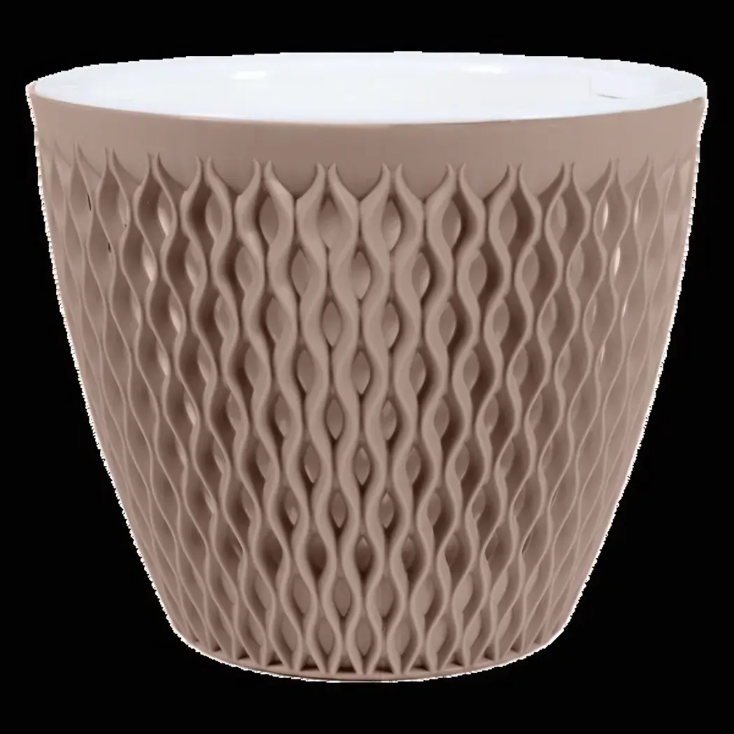 Объем кашпо составляет 1,6 литра, а диаметр — 16 см. Это идеальный размер для большинства комнатных растений. Кашпо выполнено в светло-сливочном (бежевом) цвете с рельефным узором, что делает его не только функциональным, но и декоративным элементом вашего интерьера.