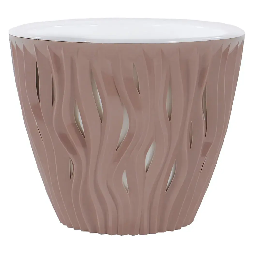 Кашпо имеет объем 1,6 литра и диаметр 16 см, что делает его подходящим для большинства комнатных растений. Бежевый цвет с белым верхом и волнистый дизайн придают ему элегантный вид, который легко впишется в любой декор. Выбирая кашпо «Вдохновение», вы получаете не только красивый, но и функциональный элемент для вашего дома.